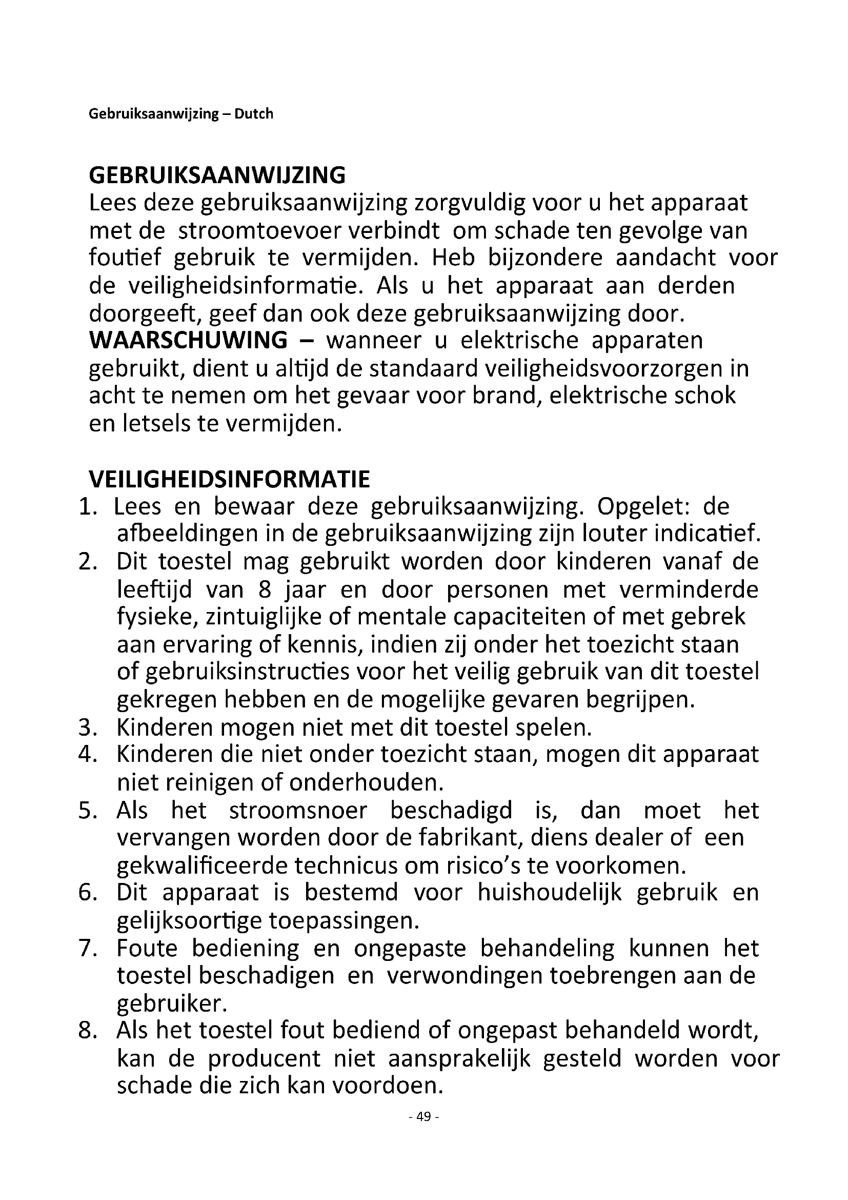 8. Als het toestel fout bediend of ongepast behandeld wordt,