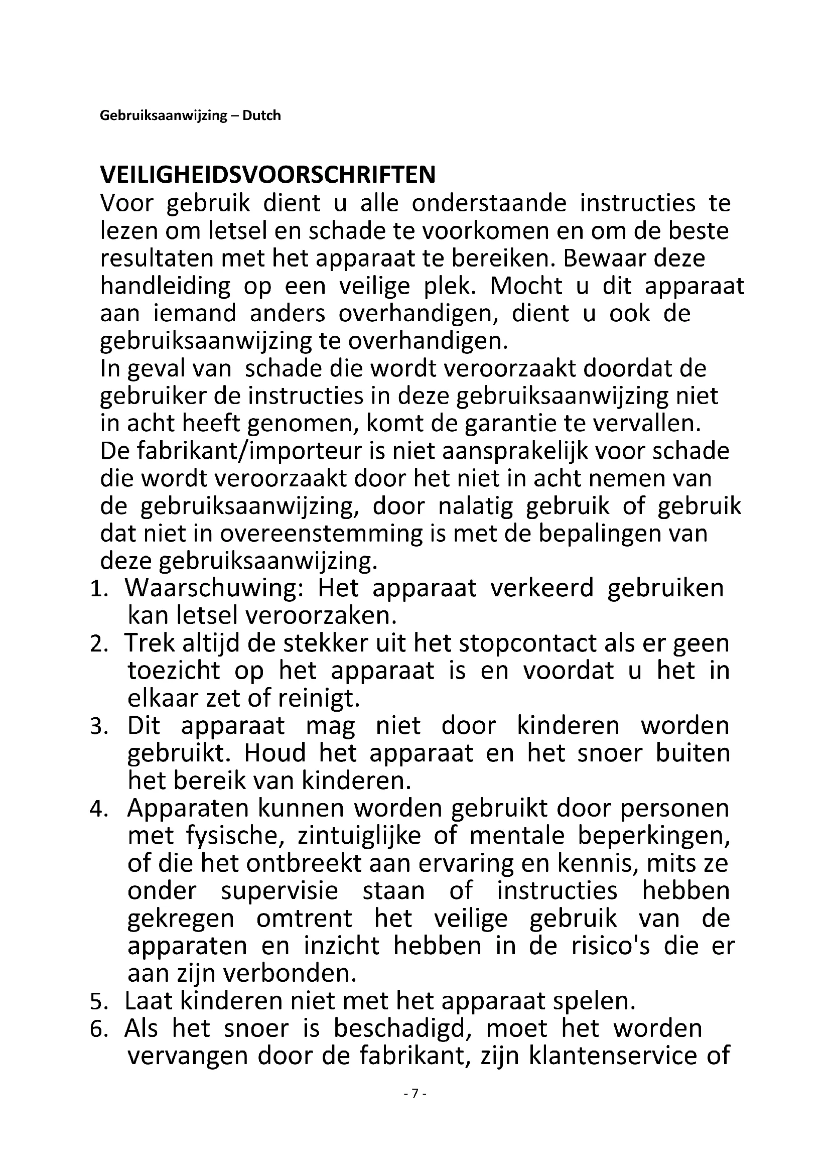 Recycling – European Directive 2012/19/EU This marking indicates that this product should not be disposed with other household wastes. To prevent possible harm to the environment or human health from uncontrolled waste disposal, recycle it responsibly to promote the sustainable reuse of material resources. To return your used device, please use the return and collection systems or contact the retailer where the product was purchased. They can take this product for environmental safe recycling. Emerio Holland B.V. Zomervaart 1A 2033 DA Haarlem The Netherlands T: +31(0)23 3034369- 7 - Gebruiksaanwijzing – Dutch VEILIGHEIDSVOORSCHRIFTEN Voor gebruik dient u alle onderstaande instructies te lezen om letsel en schade te voorkomen en om de beste resultaten met het apparaat te bereiken. Bewaar deze handleiding op een veilige plek. Mocht u dit apparaat aan iemand anders overhandigen, dient u ook de gebruiksaanwijzing te overhandigen. In geval van schade die wordt veroorzaakt doordat de gebruiker de instructies in deze gebruiksaanwijzing niet in acht heeft genomen, komt de garantie te vervallen. De fabrikant/importeur is niet aansprakelijk voor schade die wordt veroorzaakt door het niet in acht nemen van de gebruiksaanwijzing, door nalatig gebruik of gebruik dat niet in overeenstemming is met de bepalingen van deze gebruiksaanwijzing.