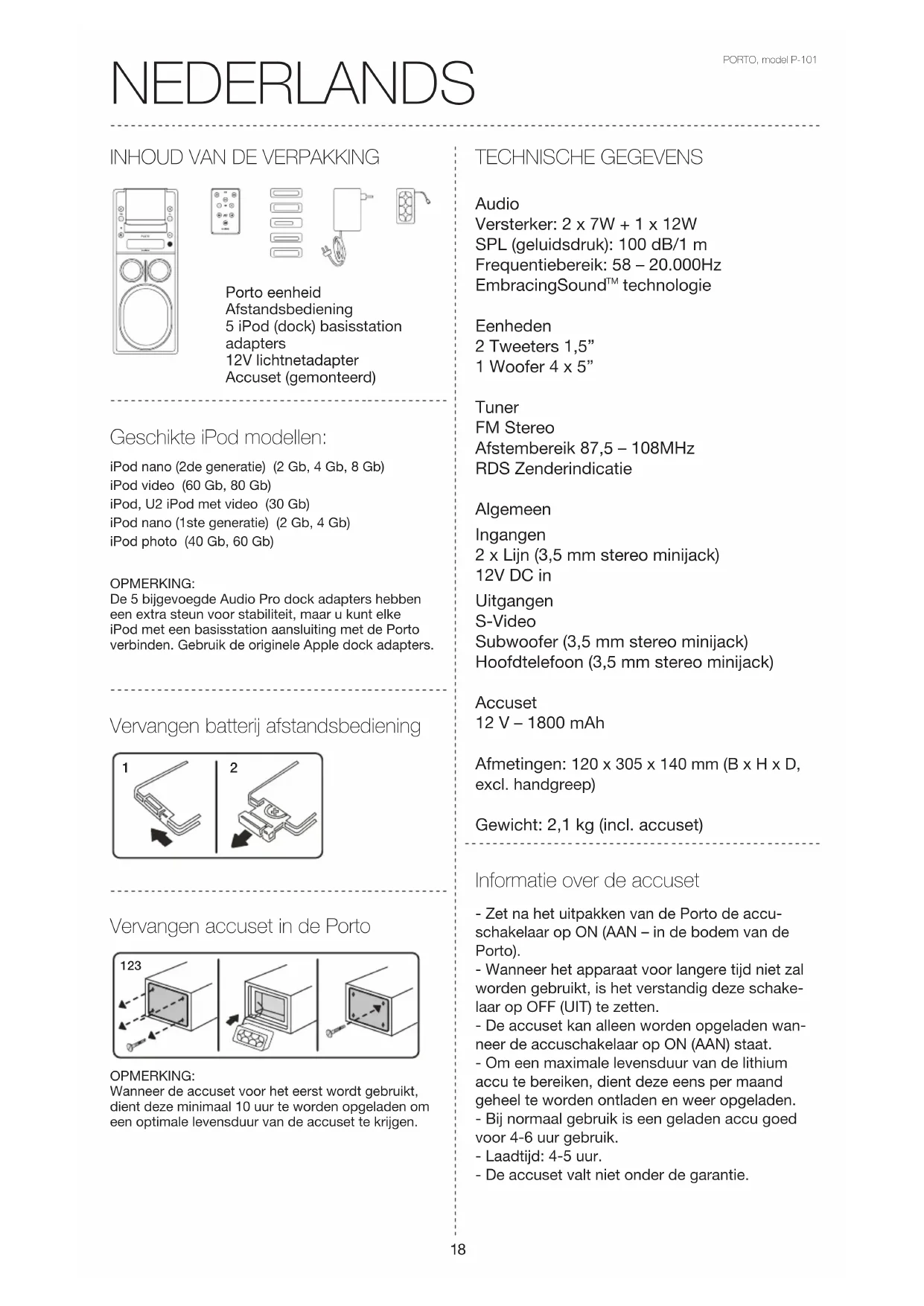 technologie Eenheden 2 Tweeters 1,5” 1 Woofer 4 x 5” Tuner FM Stereo Afstembereik 87,5 – 108MHz RDS Zenderindicatie Algemeen Ingangen 2 x Lijn (3,5 mm stereo minijack) 12V DC in Uitgangen S-Video Subwoofer (3,5 mm stereo minijack) Hoofdtelefoon (3,5 mm stereo minijack) Accuset 12 V – 1800 mAh Afmetingen: 120 x 305 x 140 mm (B x H x D, excl. handgreep) Gewicht: 2,1 kg (incl. accuset) - Zet na het uitpakken van de Porto de accu- schakelaar op ON (AAN – in de bodem van de Porto). - Wanneer het apparaat voor langere tijd niet zal worden gebruikt, is het verstandig deze schake- laar op OFF (UIT) te zetten. - De accuset kan alleen worden opgeladen wan- neer de accuschakelaar op ON (AAN) staat. - Om een maximale levensduur van de lithium accu te bereiken, dient deze eens per maand geheel te worden ontladen en weer opgeladen. - Bij normaal gebruik is een geladen accu goed voor 4-6 uur gebruik. - Laadtijd: 4-5 uur. - De accuset valt niet onder de garantie. Informatie over de accuset Porto eenheid Afstandsbediening 5 iPod (dock) basisstation adapters 12V lichtnetadapter Accuset (gemonteerd) Vervangen batterij afstandsbediening Vervangen accuset in de Porto OPMERKING:Wanneer de accuset voor het eerst wordt gebruikt, dient deze minimaal 10 uur te worden opgeladen om een optimale levensduur van de accuset te krijgen.