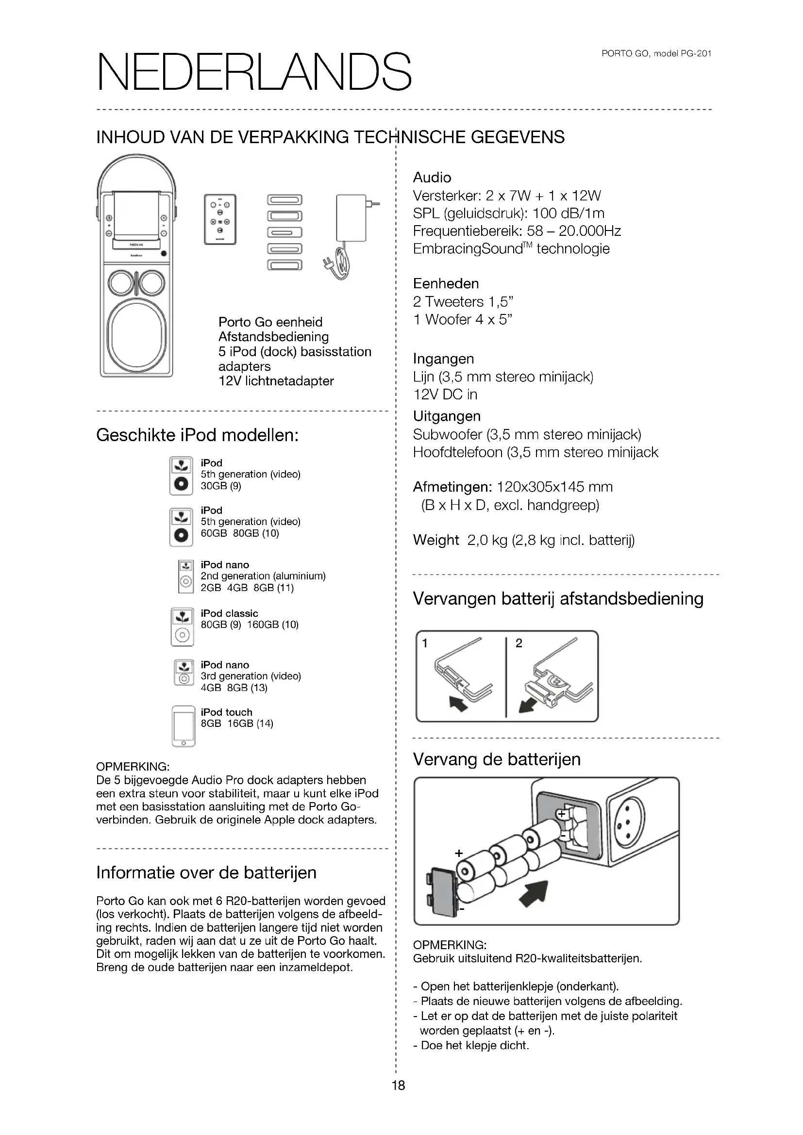 Porto Go eenheid Afstandsbediening 5 iPod (dock) basisstation adapters 12V lichtnetadapter Vervangen batterij afstandsbediening Vervang de batterijen OPMERKING:Gebruik uitsluitend R20-kwaliteitsbatterijen.- Open het batterijenklepje (onderkant).- Plaats de nieuwe batterijen volgens de afbeelding.- Let er op dat de batterijen met de juiste polariteit worden geplaatst (+ en -).- Doe het klepje dicht.OPMERKING:De 5 bijgevoegde Audio Pro dock adapters hebbeneen extra steun voor stabiliteit, maar u kunt elke iPod met een basisstation aansluiting met de Porto Go-verbinden. Gebruik de originele Apple dock adapters. Informatie over de batterijen Geschikte iPod modellen: Audio Versterker: 2 x 7W + 1 x 12W SPL (geluidsdruk): 100 dB/1m Frequentiebereik: 58 – 20.000Hz EmbracingSound