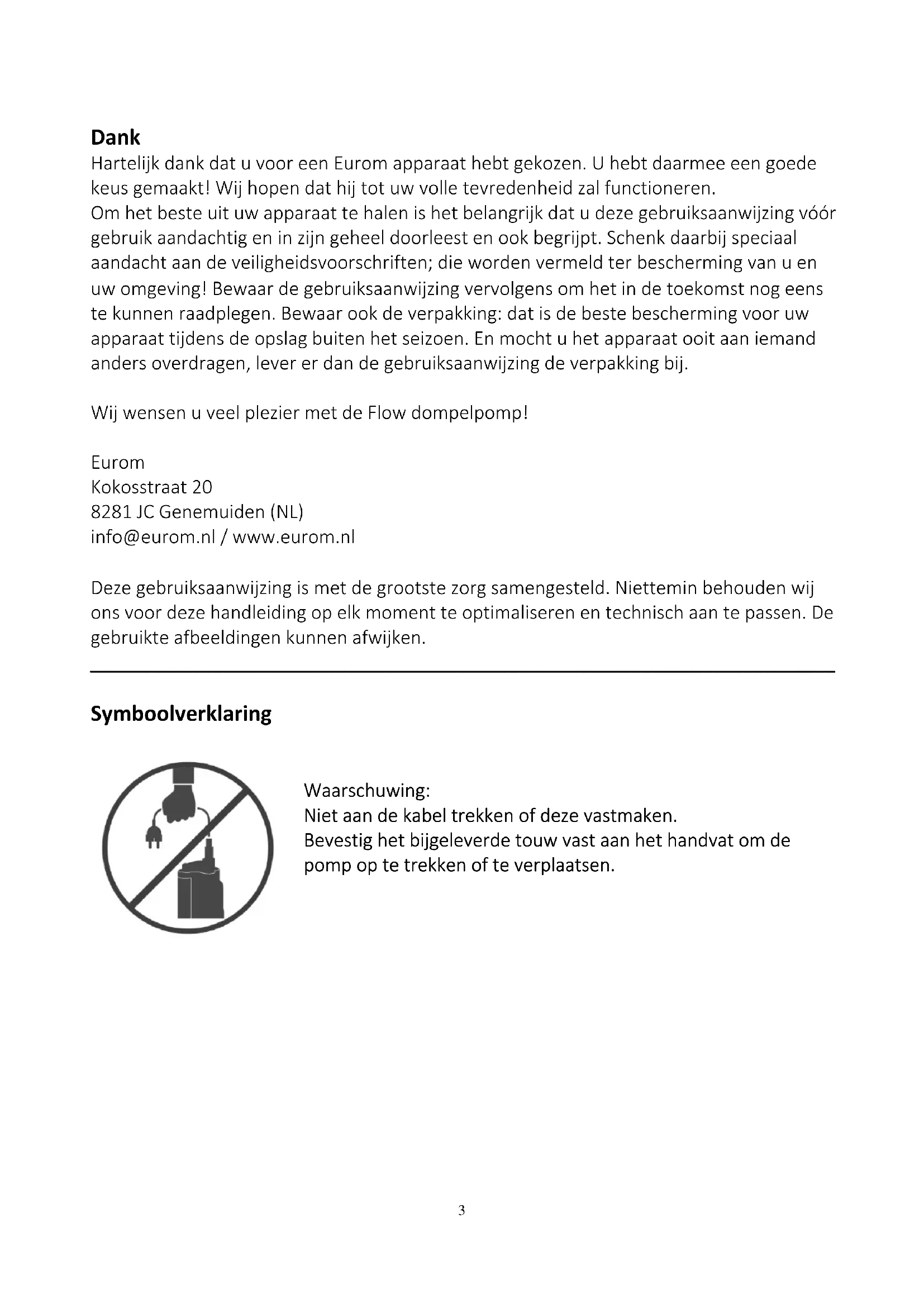 - De Eurom dompelpomp mag alleen worden gebruikt voor het transport van water.