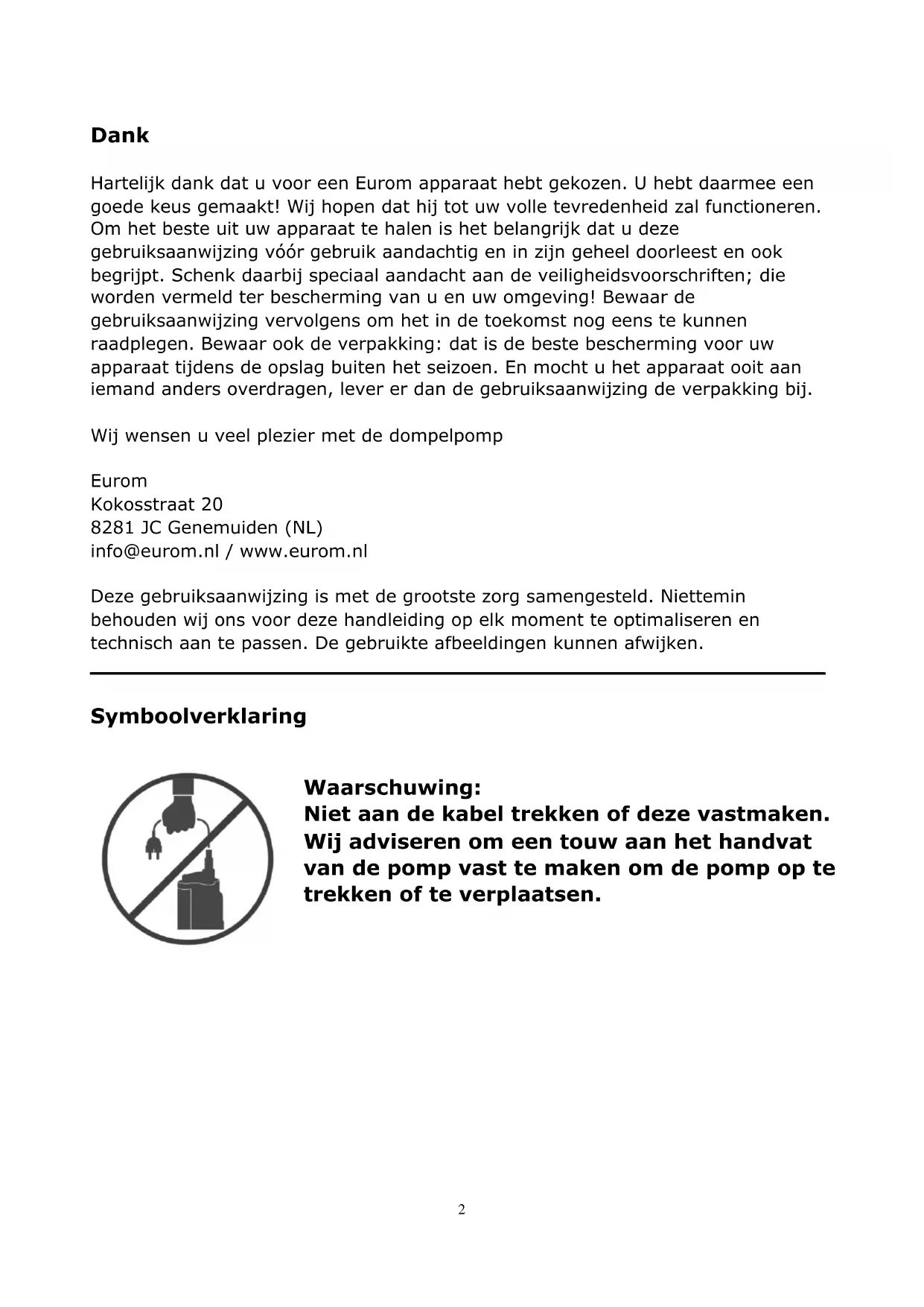 water Inlaatopeningen (deels) verstopt Waterafvoer, slang/buis deels verstopt Schoep versleten Er wordt lucht aangezogen Te weinig pompcapaciteit door vuil en zanderig water Maak ze schoon Verwijder het vuil Vervang de schoep Dompel de pomp minimaal 50 cm. onder water Maak de pomp schoon en laat uitgesleten delen vervangen Pomp start niet of slaat tijdens de werking plotseling af Thermische beveiliging stopt pomp vanwege oververhitting Het water is te warm Stroomuitval Stekker uit stopcontact Vuil of steentjes in de wateraanvoer Schoep verstopt Spoel stator doorgebrand Zie: oververhitting beveiliging Max. watertemperatuur 40°C Controleer zekeringen en aardlek herstel Verwijder vuil en steentjes Verwijder het vuil Opnieuw laten wikkelen en reviseren Winding stator doorgebrand Kortsluiting, mogelijk door lekkage Verstopte schoep De pomp te frequent gestart Pomp overbelast In alle gevallen: Oorzaak wegnemen en stator opnieuw laten wikkelen. Zend de pomp ter reparatie naar uw leverancier of servicepunt. Pomp geeft plotseling minder water Aanzuigopeningen zitten geblokkeerd Maak de openingen schoon12 Verwijdering Binnen de EU betekent dit symbool dat dit product niet met het normale huishoudelijke afval mag worden afgevoerd. Afgedankte apparaten bevatten waardevolle materialen die hergebruikt kunnen en moeten worden, om het milieu en de gezondheid niet te schaden door ongereguleerde afvalinzameling. Breng afgedankte apparatuur daarom naar een daarvoor aangewezen inzamelpunt of wend u tot het bedrijf waar u het apparaat gekocht hebt. Zij kunnen er voor zorgen dat zoveel mogelijk onderdelen van het apparaat hergebruikt worden. CE-Conformiteitsverklaring Zie pagina 46.13 Thank you Thank you very much for choosing for a Eurom device. You have made a good choice! We hope you will be satisfied about its functioning. To get maximum profit from your panel, it is important to read this manual attentive and totally before use, and to understand what is written. Read especially the safety instructions: they are there to protect you and your environment. Keep the manual in a safe place for future reference. Store also the package: that is the best protection for your heater in times of no-use. And if you at any time pass the appliance on, pass on the manual and package too. We wish you a lot of fun with the Flow submersible pump! Eurom Kokosstraat 20 8281 JC Genemuiden (NL) info@eurom.nl www.eurom.nl This manual has been complied with the utmost care. Nevertheless, we reserve the right to optimize this manual at any time and to adjust it technically. The images used may differ.