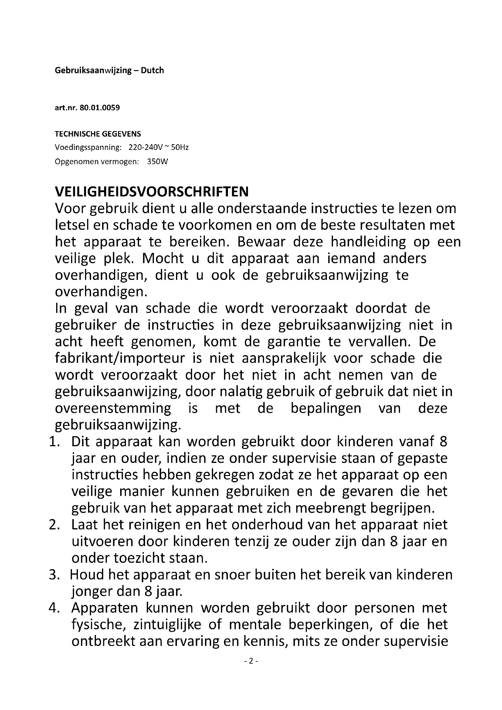 Inhoud – Teneur – Content – Inhalt – Contenido Gebruiksaanwijzing – Dutch ...................................................................... - 2 - Mode d‘emploi – French ........................................................................... - 8 - Instruction manual – English ................................................................... - 14 - Bedienungsanleitung – German .............................................................. - 19 - Manual de Instrucciones – Spanish ......................................................... - 25 -- 2 - Gebruiksaanwijzing – Dutch art.nr. 80.01.0059 TECHNISCHE GEGEVENS Voedingsspanning: 220-240V ~ 50Hz Opgenomen vermogen: 350W VEILIGHEIDSVOORSCHRIFTEN Voor gebruik dient u alle onderstaande instructies te lezen om letsel en schade te voorkomen en om de beste resultaten met het apparaat te bereiken. Bewaar deze handleiding op een veilige plek. Mocht u dit apparaat aan iemand anders overhandigen, dient u ook de gebruiksaanwijzing te overhandigen. In geval van schade die wordt veroorzaakt doordat de gebruiker de instructies in deze gebruiksaanwijzing niet in acht heeft genomen, komt de garantie te vervallen. De fabrikant/importeur is niet aansprakelijk voor schade die wordt veroorzaakt door het niet in acht nemen van de gebruiksaanwijzing, door nalatig gebruik of gebruik dat niet in overeenstemming is met de bepalingen van deze gebruiksaanwijzing.