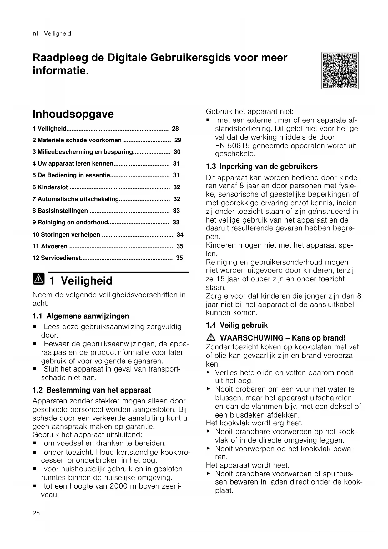- 12 Servicedienst 1 Veiligheid Neem de volgende veiligheidsvoorschriften in acht. 1.1 Algemene aanwijzingen ¡ Lees deze gebruiksaanwijzing zorgvuldig door. ¡ Bewaar de gebruiksaanwijzingen, de appa- raatpas en de productinformatie voor later gebruik of voor volgende eigenaren. ¡ Sluit het apparaat in geval van transport- schade niet aan. 1.2 Bestemming van het apparaat Apparaten zonder stekker mogen alleen door geschoold personeel worden aangesloten. Bij schade door een verkeerde aansluiting kunt u geen aanspraak maken op garantie. Gebruik het apparaat uitsluitend: ¡ om voedsel en dranken te bereiden. ¡ onder toezicht. Houd kortstondige kookpro- cessen ononderbroken in het oog. ¡ voor huishoudelijk gebruik en in gesloten ruimtes binnen de huiselijke omgeving. ¡ tot een hoogte van 2000m boven zeeni- veau. Gebruik het apparaat niet: ¡ met een externe timer of een separate af- standsbediening. Dit geldt niet voor het ge- val dat de werking middels de door EN50615 genoemde apparaten wordt uit- geschakeld. 1.3 Inperking van de gebruikers Dit apparaat kan worden bediend door kinde- ren vanaf 8 jaar en door personen met fysie- ke, sensorische of geestelijke beperkingen of met gebrekkige ervaring en/of kennis, indien zij onder toezicht staan of zijn geïnstrueerd in het veilige gebruik van het apparaat en de daaruit resulterende gevaren hebben begre- pen. Kinderen mogen niet met het apparaat spe- len. Reiniging en gebruikersonderhoud mogen niet worden uitgevoerd door kinderen, tenzij ze 15jaar of ouder zijn en onder toezicht staan. Zorg ervoor dat kinderen die jonger zijn dan 8 jaar niet bij het apparaat of de aansluitkabel kunnen komen. 1.4 Veilig gebruik WAARSCHUWING‒Kans op brand! Zonder toezicht koken op kookplaten met vet of olie kan gevaarlijk zijn en brand veroorza- ken. p. 35