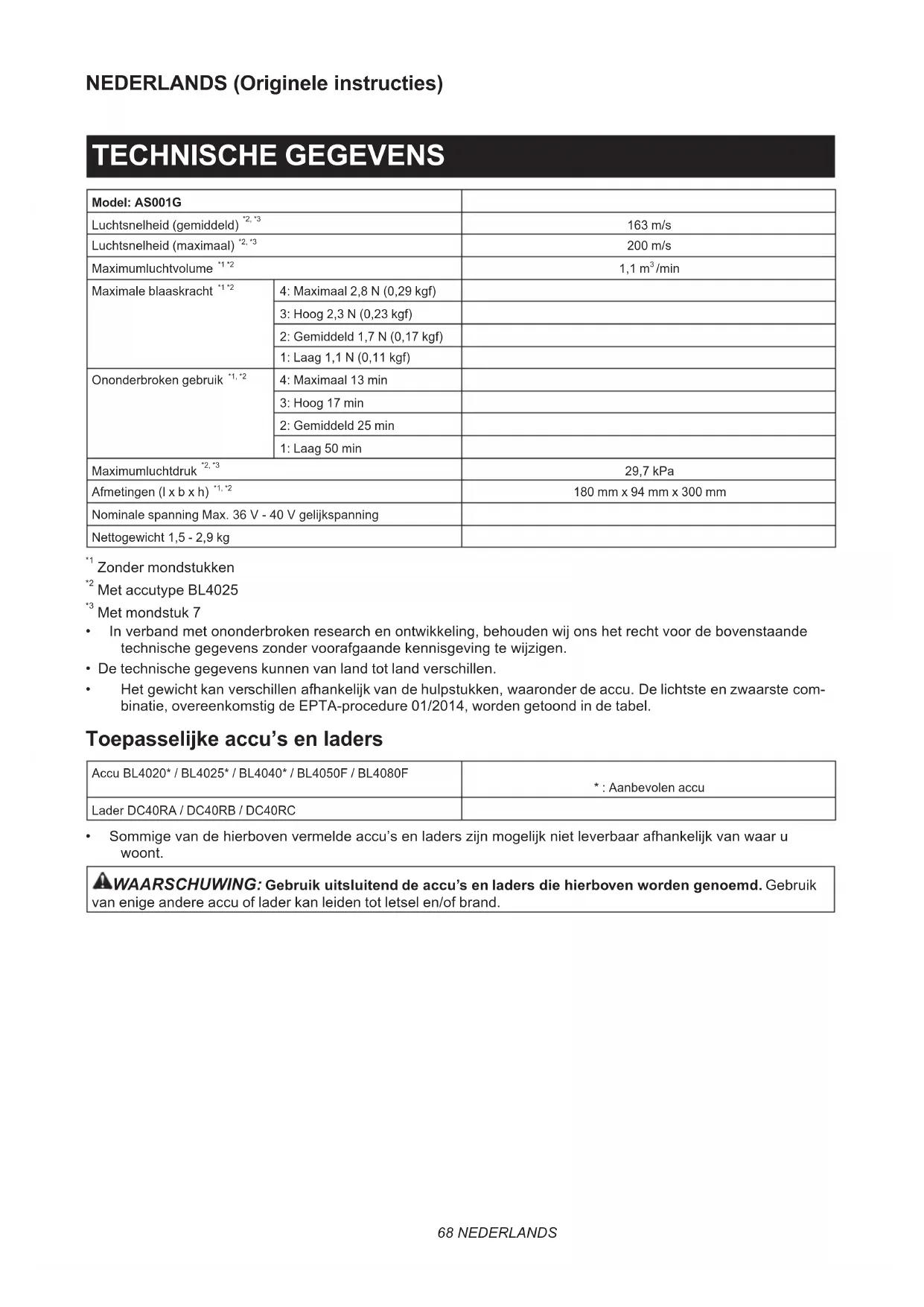 - Hetgewichtkanverschillenafhankelijkvandehulpstukken,waaronderdeaccu.Delichtsteenzwaarstecom- binatie, overeenkomstig de EPTA-procedure 01/2014, worden getoond in de tabel. Toepasselijke accu’s en laders Accu BL4020* / BL4025* / BL4040* / BL4050F / BL4080F