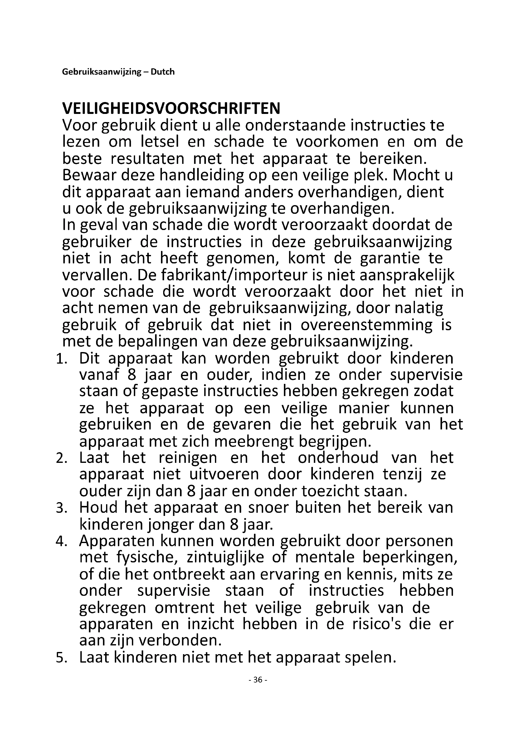 Återvinning - EU-direktiv 2012/19/EU Denna markering indikerar att produkten inte får kastas tillsammans med övrigt hushållsavfall. För att förhindra eventuell skada på miljön eller människors hälsa på grund av okontrollerad avfallshantering, återvinns de på ett ansvarsfullt sätt som främjar en hållbar återanvändning av materiella resurser. För att återlämna den använda enheten, använd retur- och insamlingssystem eller kontakta återförsäljaren där produkten var köpt. De kan ta denna produkt för miljösäker återvinning. Emerio B.V. Customer service: Kundeninformation: Klantenservice: Zomervaart 1A T: +31 (0) 23 3034369 T: +49 (0) 3222 1097 600 T: +31 (0) 23 3034369 2033 DA Haarlem E: info@emerio.eu E: info.de@emerio.eu E: info.nl@emerio.eu The Netherlands- 36 - Gebruiksaanwijzing – Dutch VEILIGHEIDSVOORSCHRIFTEN Voor gebruik dient u alle onderstaande instructies te lezen om letsel en schade te voorkomen en om de beste resultaten met het apparaat te bereiken. Bewaar deze handleiding op een veilige plek. Mocht u dit apparaat aan iemand anders overhandigen, dient u ook de gebruiksaanwijzing te overhandigen. In geval van schade die wordt veroorzaakt doordat de gebruiker de instructies in deze gebruiksaanwijzing niet in acht heeft genomen, komt de garantie te vervallen. De fabrikant/importeur is niet aansprakelijk voor schade die wordt veroorzaakt door het niet in acht nemen van de gebruiksaanwijzing, door nalatig gebruik of gebruik dat niet in overeenstemming is met de bepalingen van deze gebruiksaanwijzing.