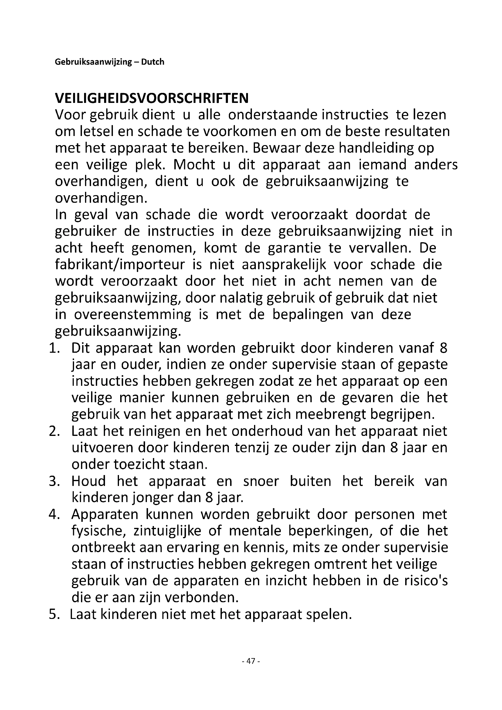 Reciclaje – Directiva Europea 2012/19/UE Este símbolo indica que el producto no debe desecharse con otros residuos domésticos. Para evitar posibles daños al medioambiente o a la salud humana derivados de la eliminación descontrolada de residuos, recicle de manera responsable para promover la reutilización sostenible de los recursos materiales. Para devolver su aparato usado, utilice los sistemas de devolución y recogida o contacte con el minorista al que compró el producto. Ellos pueden enviar este producto para su reciclaje medioambientalmente seguro. FUN NORDIC ApS Egelund 8 6200 Aabenraa Denmark www.funnordic.dk- 47 - Gebruiksaanwijzing – Dutch VEILIGHEIDSVOORSCHRIFTEN Voor gebruik dient u alle onderstaande instructies te lezen om letsel en schade te voorkomen en om de beste resultaten met het apparaat te bereiken. Bewaar deze handleiding op een veilige plek. Mocht u dit apparaat aan iemand anders overhandigen, dient u ook de gebruiksaanwijzing te overhandigen. In geval van schade die wordt veroorzaakt doordat de gebruiker de instructies in deze gebruiksaanwijzing niet in acht heeft genomen, komt de garantie te vervallen. De fabrikant/importeur is niet aansprakelijk voor schade die wordt veroorzaakt door het niet in acht nemen van de gebruiksaanwijzing, door nalatig gebruik of gebruik dat niet in overeenstemming is met de bepalingen van deze gebruiksaanwijzing.