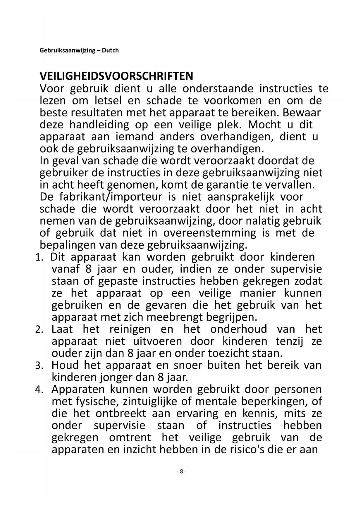 vanaf 8 jaar en ouder, indien ze onder supervisie staan of gepaste instructies hebben gekregen zodat ze het apparaat op een veilige manier kunnen gebruiken en de gevaren die het gebruik van het apparaat met zich meebrengt begrijpen.