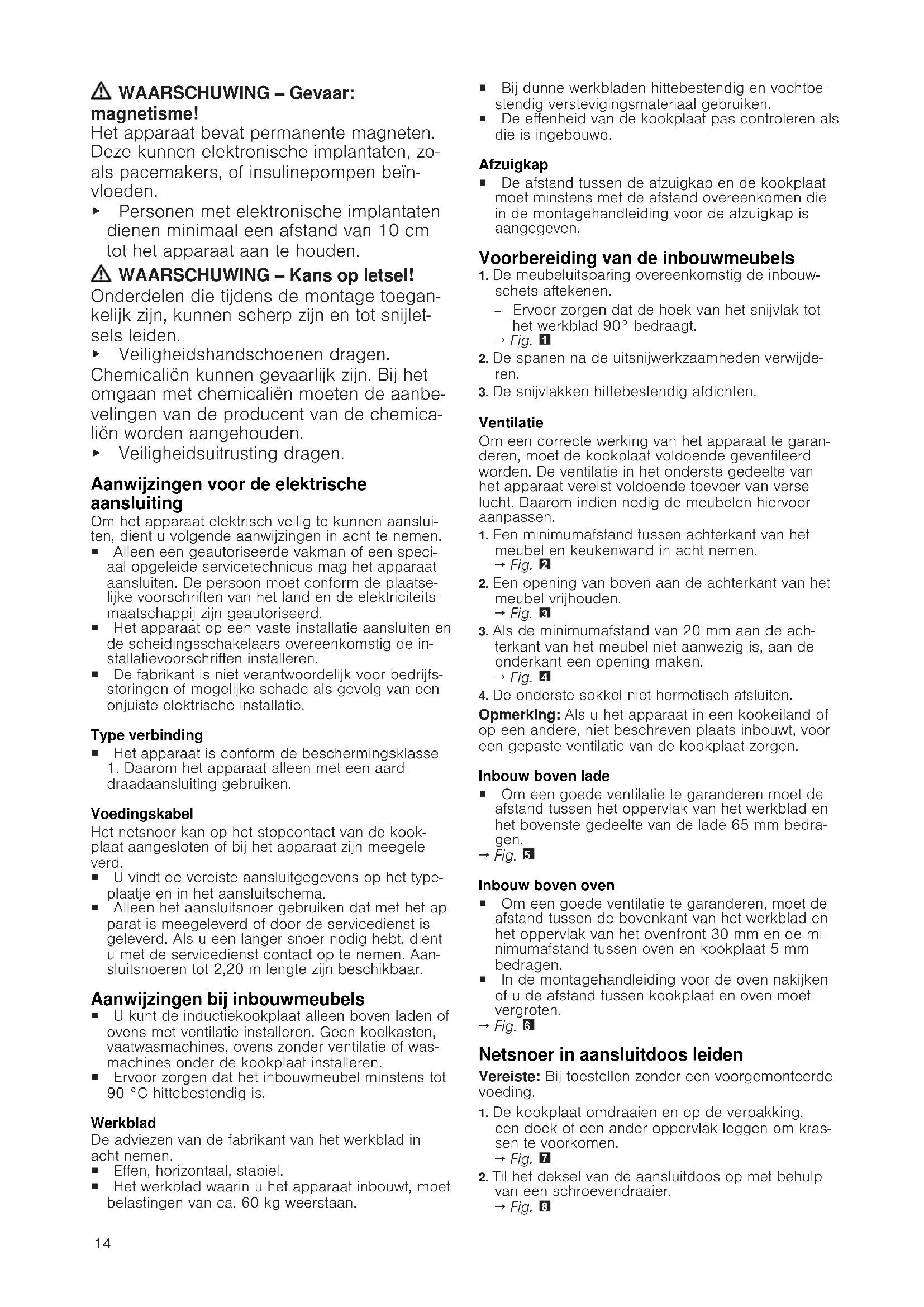 Algemene aanwijzingen ¡ Lees deze gebruiksaanwijzing zorgvuldig door. ¡ Alleen een geautoriseerde vakman mag het apparaat aansluiten. ¡ Een ondeskundige installatie, opening van het apparaat, verbinding of montage leidt tot het verlies van de geldigheid van de productgarantie. ¡ Sluit voor aanvang van alle werkzaamhe- den altijd de stroomtoevoer af. ¡ Na de installatie garanderen dat de ge- bruiker geen toegang tot de elektrische componenten heeft. ¡ Dit apparaat nooit in boten of voertuigen gebruiken. Veilige montage Neem bij het monteren van het apparaat de veiligheidsaanwijzingen in acht. Alleen bij een deskundige inbouw overeen- komstig de montagehandleiding is de veilig- heid bij het gebruik gegarandeerd. De in- stallateur is voor het perfect functioneren van het apparaat op de plaats van opstel- ling verantwoordelijk.14 WAARSCHUWING‒Gevaar: magnetisme! Het apparaat bevat permanente magneten. Deze kunnen elektronische implantaten, zo- als pacemakers, of insulinepompen beïn- vloeden. ▶ Personen met elektronische implantaten dienen minimaal een afstand van 10 cm tot het apparaat aan te houden. WAARSCHUWING‒Kans op letsel! Onderdelen die tijdens de montage toegan- kelijk zijn, kunnen scherp zijn en tot snijlet- sels leiden. ▶ Veiligheidshandschoenen dragen. Chemicaliën kunnen gevaarlijk zijn. Bij het omgaan met chemicaliën moeten de aanbe- velingen van de producent van de chemica- liën worden aangehouden. ▶ Veiligheidsuitrusting dragen. Aanwijzingen voor de elektrische aansluiting Om het apparaat elektrisch veilig te kunnen aanslui- ten, dient u volgende aanwijzingen in acht te nemen. ¡ Alleen een geautoriseerde vakman of een speci- aal opgeleide servicetechnicus mag het apparaat aansluiten. De persoon moet conform de plaatse- lijke voorschriften van het land en de elektriciteits- maatschappij zijn geautoriseerd. ¡ Het apparaat op een vaste installatie aansluiten en de scheidingsschakelaars overeenkomstig de in- stallatievoorschriften installeren. ¡ De fabrikant is niet verantwoordelijk voor bedrijfs- storingen of mogelijke schade als gevolg van een onjuiste elektrische installatie. Type verbinding ¡ Het apparaat is conform de beschermingsklasse