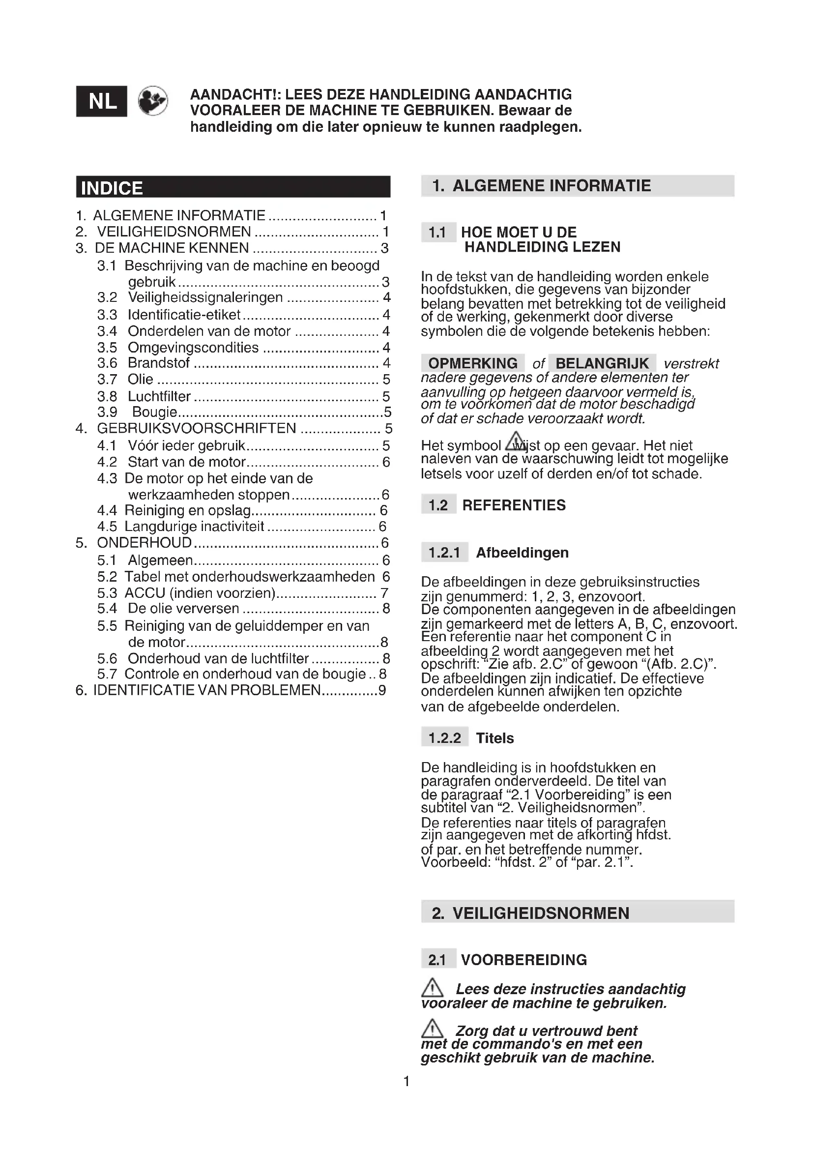 Deze machine is een explosiemotor. De motor is een toestel waarvan de prestaties, normale werking en levensduur door vele factoren worden bepaald; sommige factoren zijn externe factoren, andere zijn strikt verbonden4 met de kwaliteit van de gebruikte producten en met de regelmaat van het onderhoud. Hierna wordt bijkomende informatie verstrekt, aan de hand waarvan een bewuster gebruik van uw machine kan worden gemaakt. Ieder ander gebruik dat afwijkt van bovenstaande toepassingen, kan gevaarlijk zijn en schade voor personen en/of voorwerpen veroorzaken. BELANGRIJK Wanneer de machine oneigenlijk wordt gebruikt, vervalt de garantie en wijst de constructeur alle verantwoordelijkheid af; alle onkosten voor eigen schade of letsels of aan derden worden bijgevolg op de gebruiker verhaald.