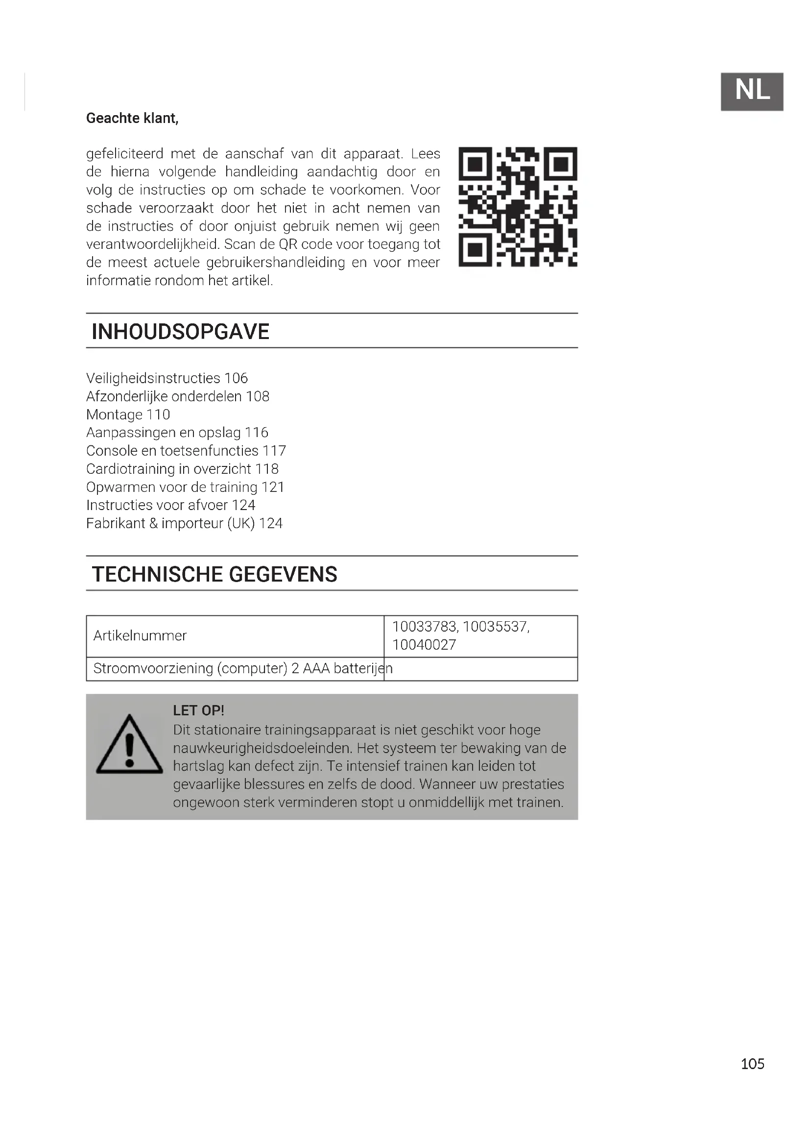 Geachte klant, gefeliciteerd met de aanschaf van dit apparaat. Lees de hierna volgende handleiding aandachtig door en volg de instructies op om schade te voorkomen. Voor schade veroorzaakt door het niet in acht nemen van de instructies of door onjuist gebruik nemen wij geen verantwoordelijkheid. Scan de QR code voor toegang tot de meest actuele gebruikershandleiding en voor meer informatie rondom het artikel. INHOUDSOPGAVE Veiligheidsinstructies 106 Afzonderlijke onderdelen 108 Montage 110 Aanpassingen en opslag 116 Console en toetsenfuncties 117 Cardiotraining in overzicht 118 Opwarmen voor de training 121 Instructies voor afvoer 124 Fabrikant & importeur (UK) 124 TECHNISCHE GEGEVENS Artikelnummer 10033783, 10035537,