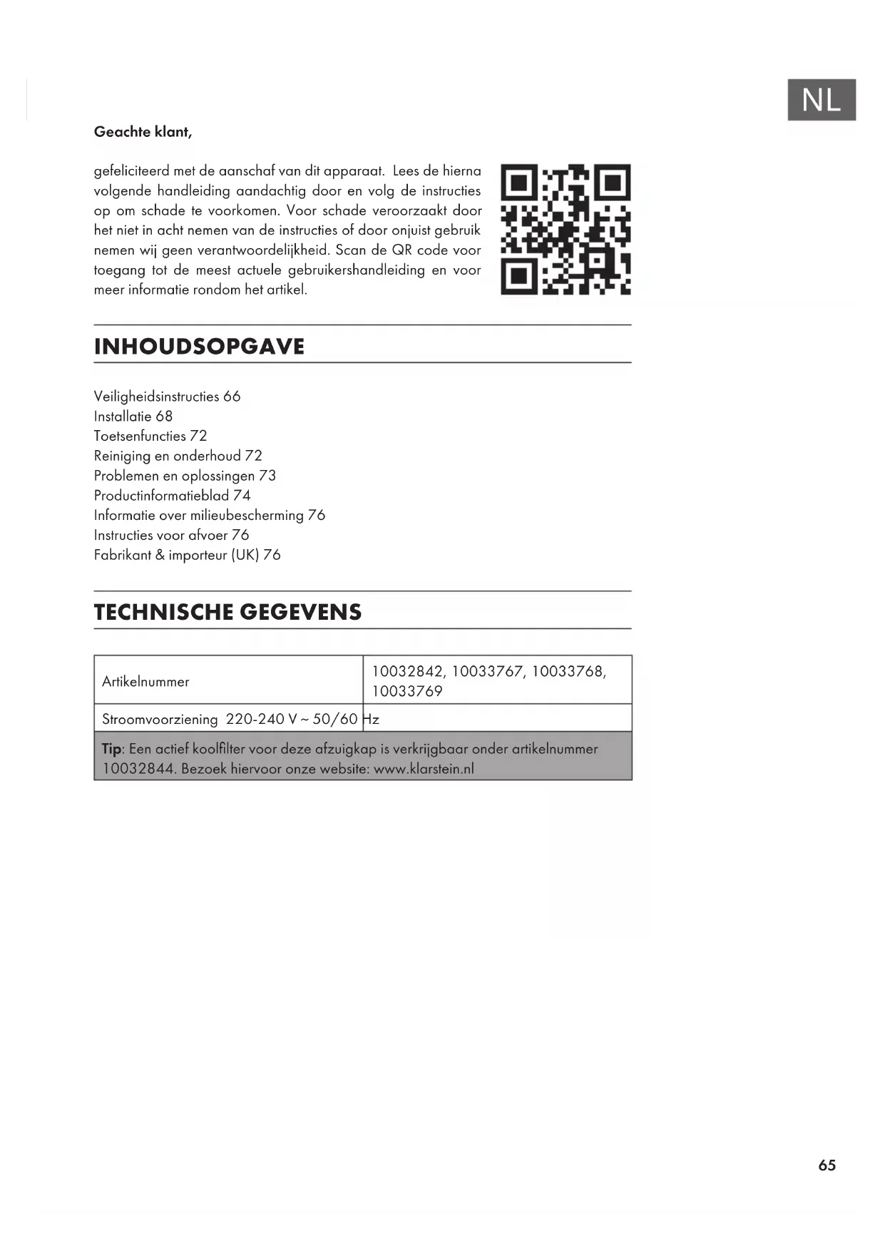 Geachte klant, gefeliciteerd met de aanschaf van dit apparaat. Lees de hierna volgende handleiding aandachtig door en volg de instructies op om schade te voorkomen. Voor schade veroorzaakt door het niet in acht nemen van de instructies of door onjuist gebruik nemen wij geen verantwoordelijkheid. Scan de QR code voor toegang tot de meest actuele gebruikershandleiding en voor meer informatie rondom het artikel. INHOUDSOPGAVE Veiligheidsinstructies66 Installatie68 Toetsenfuncties72 Reiniging en onderhoud72 Problemen en oplossingen73 Productinformatieblad74 Informatie over milieubescherming76 Instructies voor afvoer76 Fabrikant & importeur (UK)76 TECHNISCHE GEGEVENS Artikelnummer 10032842, 10033767, 10033768,