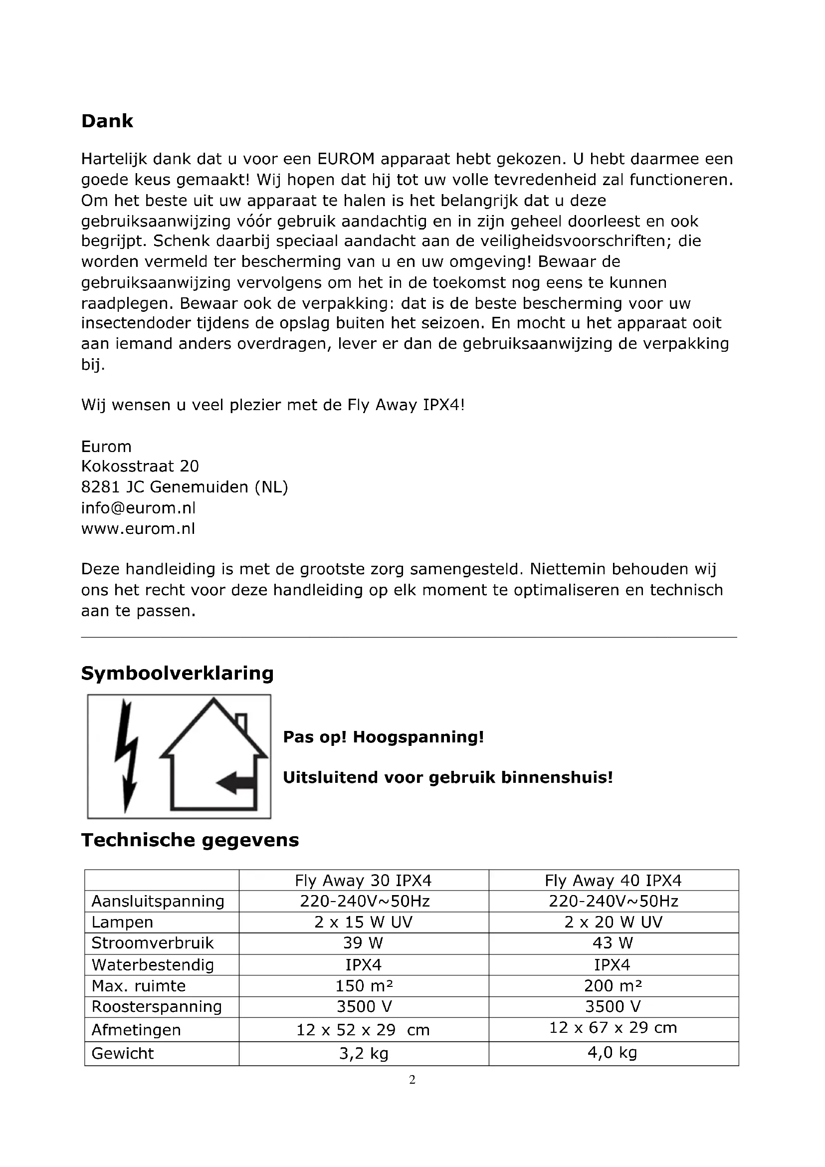 tocht/luchtstroom. Het plaatsen van de insectendoder in de tochtstroom zal dus niet effectief zijn. Gebruik en onderhoud Ingebruikname Controleer of het door u te gebruiken stopcontact geaard is en de juiste spanning (220-240V~50Hz) afgeeft. U stelt het apparaat in werking door de stekker in het stopcontact te steken. Het apparaat treedt in werking. De insectendoder kan continu (24 uur p.d.) worden gebruikt, het hele jaar. Lampen vervangen Om een versleten UV-buis te vervangen haalt u de stekker uit het stopcontact en verwijdert u de opvanglade door hem aan de zijkant uit het apparaat te trekken. Draai de 2x2 schroeven naast de ophangogen los. Verwijder ophangogen en bovenkap. Schroef nu de 2x2 schroefjes aan de voor- en achterkant van de grill los en til het hele elektroblok met de lampen uit de grill. Draai links en rechts de ring om de lampbevestiging los. Schuif de rubberen ringen en de binnenste plastic ringen weg. Nu kunt u de tl-buis 90° draaien, uit de bevestiging nemen en vervangen. Breng lampen, ringen, rooster en lade weer in de originele positie voor u het apparaat opnieuw in gebruik neemt.6 Reiniging Ledig regelmatig de opvanglade door hem aan de zijkant uit het apparaat te trekken. Teveel stof beïnvloedt de effectiviteit van het licht, teveel vuil de vernietiging van de insecten; maak het apparaat dus regelmatig schoon. Neem de stekker uit het stopcontact en verwijder de opvanglade. Wanneer u het apparaat nu neerlegt kunt u met bijv. de stofzuiger, een plumeau of zacht borsteltje stof en vuil uit het apparaat verwijderen. Gebruik geen vocht in het apparaat en geen agressieve schoonmaakmiddelen. De buitenzijde van het apparaat kunt u met een zachte doek afstoffen. Eventuele storingen De lampen branden niet De lamp maakt geen contact. Herstel dit. De lamp is versleten. Vervang hem. De starter is kapot. Laat hem vervangen. De smoorspoel is kapot. Laat hem vervangen. De stekker zit niet goed in het stopcontact. Sluit hem goed aan. Er staat geen stroom op het rooster De stroomdraad naar het rooster is onderbroken. Laat dit repareren. Er is kortsluiting ontstaan in de transformator. Laat hem repareren/vervangen. Voor u een reparatie uitvoert altijd eerst de stekker uit het stopcontact nemen! Verwijdering Binnen de EU betekent dit symbool dat dit product niet met het normale huishoudelijke afval mag worden afgevoerd. Afgedankte apparaten bevatten waardevolle materialen die hergebruikt kunnen en moeten worden, om het milieu en de gezondheid niet te schaden door ongereguleerde afvalinzameling. Breng afgedankte apparatuur daarom naar een daarvoor aangewezen inzamelpunt of wend u tot het bedrijf waar u het apparaat gekocht hebt. Zij kunnen er voor zorgen dat zoveel mogelijk onderdelen van het apparaat hergebruikt worden. CE–verklaring Zie pagina 34.7 Thanks Thank you very much for choosing for a EUROM product. You have made a good choice! We hope you will be satisfied about its functioning. To get maximum profit from your product, it is important to read this manual attentive and totally before use, and to understand what is written. Read especially the safety instructions: they are there to protect you and your environment. Keep the manual in a safe place for future reference. Store also the package: that is the best protection for your insect-killer in times of no-use. And if you at any time pass the appliance on, pass on the manual and package too. We wish you a lot of fun with the Fly Away IPX4! Eurom Kokosstraat 20 8281 JC Genemuiden (NL) info@eurom.nl www.eurom.nl