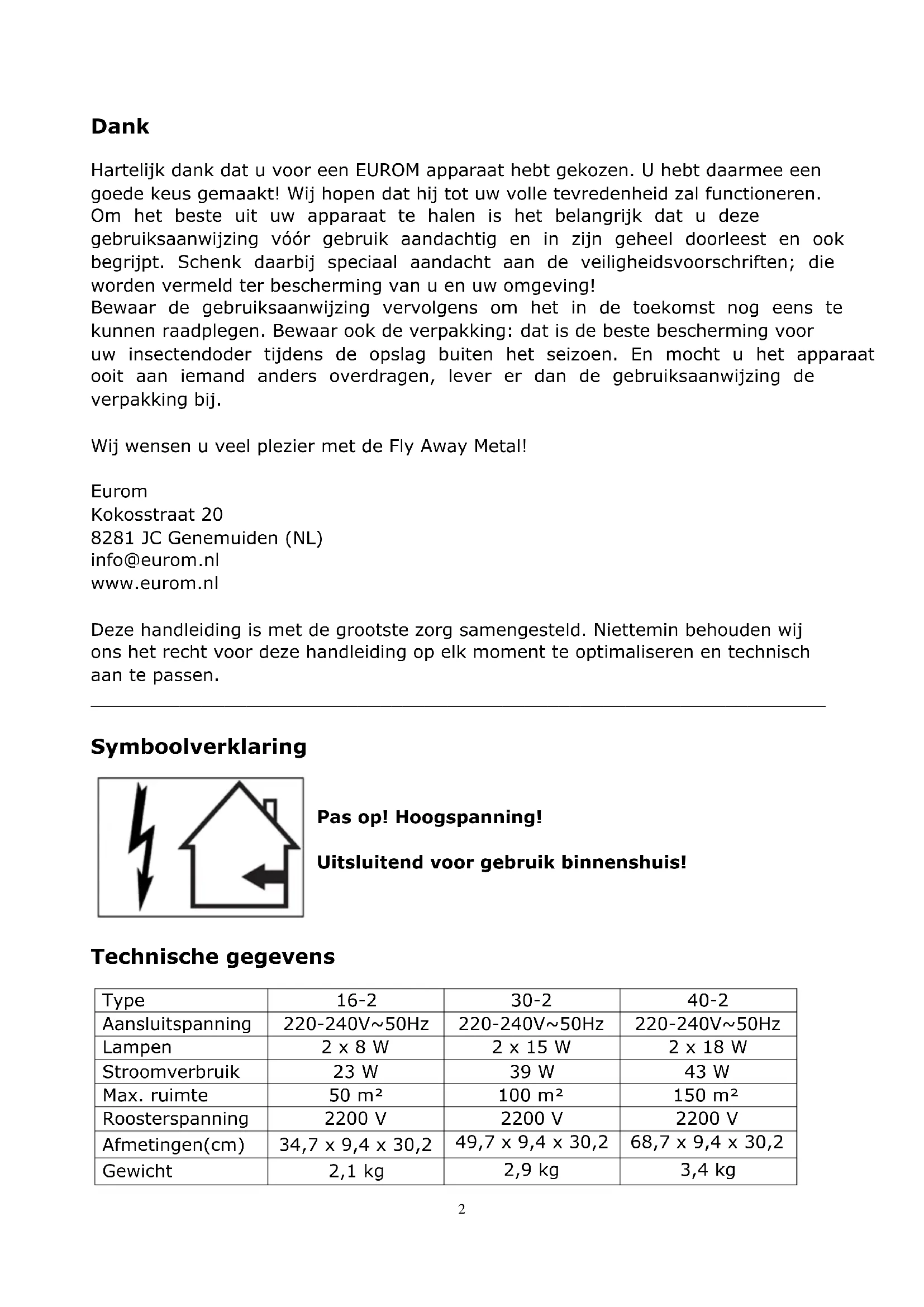 Dank Hartelijk dank dat u voor een EUROM apparaat hebt gekozen. U hebt daarmee een goede keus gemaakt! Wij hopen dat hij tot uw volle tevredenheid zal functioneren. Om het beste uit uw apparaat te halen is het belangrijk dat u deze gebruiksaanwijzing vóór gebruik aandachtig en in zijn geheel doorleest en ook begrijpt. Schenk daarbij speciaal aandacht aan de veiligheidsvoorschriften; die worden vermeld ter bescherming van u en uw omgeving! Bewaar de gebruiksaanwijzing vervolgens om het in de toekomst nog eens te kunnen raadplegen. Bewaar ook de verpakking: dat is de beste bescherming voor uw insectendoder tijdens de opslag buiten het seizoen. En mocht u het apparaat ooit aan iemand anders overdragen, lever er dan de gebruiksaanwijzing de verpakking bij. Wij wensen u veel plezier met de Fly Away Metal! Eurom Kokosstraat 20 8281 JC Genemuiden (NL) info@eurom.nl www.eurom.nl Deze handleiding is met de grootste zorg samengesteld. Niettemin behouden wij ons het recht voor deze handleiding op elk moment te optimaliseren en technisch aan te passen.