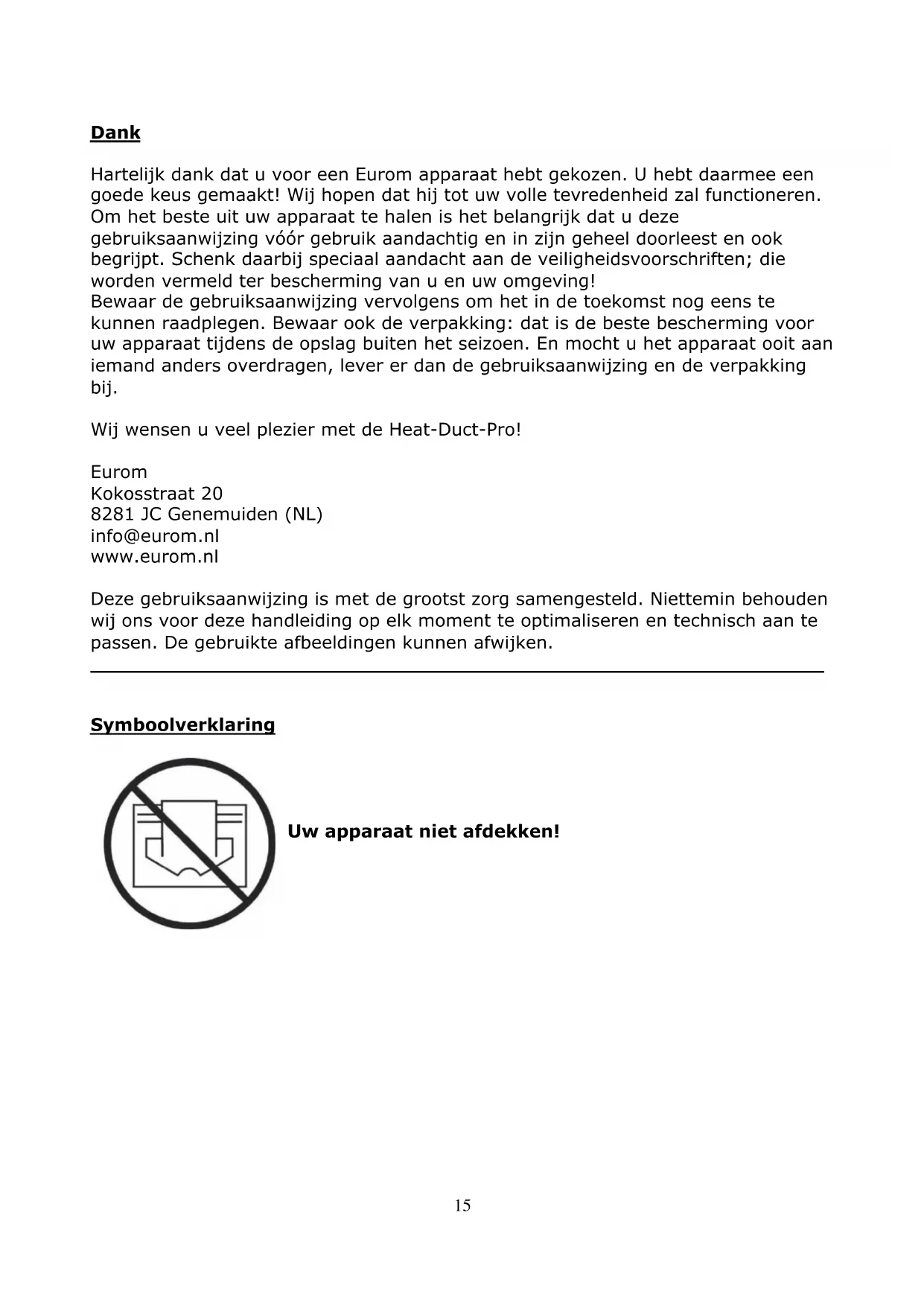 Capteur à globe noir Non Coordonnées de contact Eurom - Kokosstraat 20 - 8281 JC - Genemuiden - The Netherlands15 Dank Hartelijk dank dat u voor een Eurom apparaat hebt gekozen. U hebt daarmee een goede keus gemaakt! Wij hopen dat hij tot uw volle tevredenheid zal functioneren. Om het beste uit uw apparaat te halen is het belangrijk dat u deze gebruiksaanwijzing vóór gebruik aandachtig en in zijn geheel doorleest en ook begrijpt. Schenk daarbij speciaal aandacht aan de veiligheidsvoorschriften; die worden vermeld ter bescherming van u en uw omgeving! Bewaar de gebruiksaanwijzing vervolgens om het in de toekomst nog eens te kunnen raadplegen. Bewaar ook de verpakking: dat is de beste bescherming voor uw apparaat tijdens de opslag buiten het seizoen. En mocht u het apparaat ooit aan iemand anders overdragen, lever er dan de gebruiksaanwijzing en de verpakking bij. Wij wensen u veel plezier met de Heat-Duct-Pro! Eurom Kokosstraat 20 8281 JC Genemuiden (NL) info@eurom.nl www.eurom.nl Deze gebruiksaanwijzing is met de grootst zorg samengesteld. Niettemin behouden wij ons voor deze handleiding op elk moment te optimaliseren en technisch aan te passen. De gebruikte afbeeldingen kunnen afwijken.