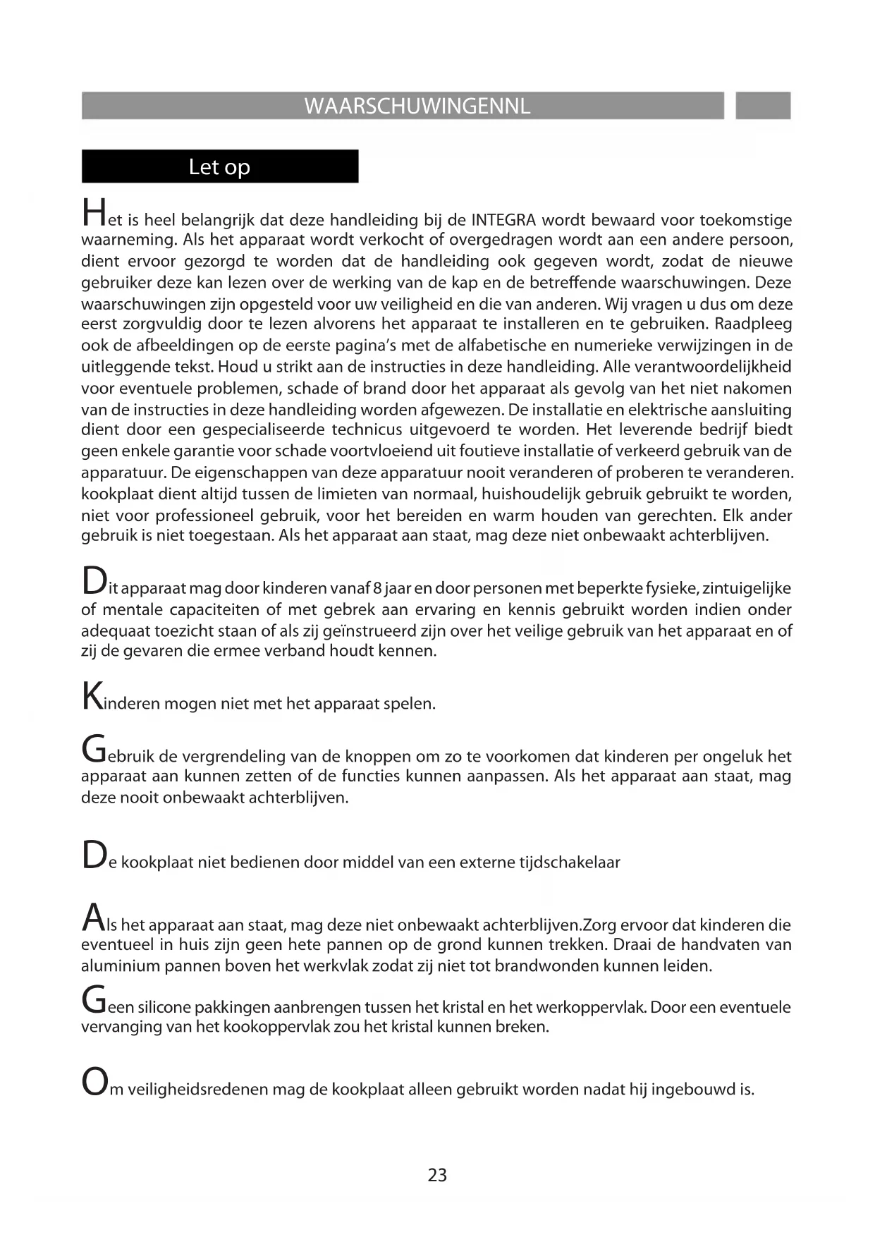 Het is heel belangrijk dat deze handleiding bij de INTEGRA wordt bewaard voor toekomstige waarneming. Als het apparaat wordt verkocht of overgedragen wordt aan een andere persoon, dient ervoor gezorgd te worden dat de handleiding ook gegeven wordt, zodat de nieuwe gebruiker deze kan lezen over de werking van de kap en de betreende waarschuwingen. Deze waarschuwingen zijn opgesteld voor uw veiligheid en die van anderen. Wij vragen u dus om deze eerst zorgvuldig door te lezen alvorens het apparaat te installeren en te gebruiken. Raadpleeg ook de afbeeldingen op de eerste pagina’s met de alfabetische en numerieke verwijzingen in de uitleggende tekst. Houd u strikt aan de instructies in deze handleiding. Alle verantwoordelijkheid voor eventuele problemen, schade of brand door het apparaat als gevolg van het niet nakomen van de instructies in deze handleiding worden afgewezen. De installatie en elektrische aansluiting dient door een gespecialiseerde technicus uitgevoerd te worden. Het leverende bedrijf biedt geen enkele garantie voor schade voortvloeiend uit foutieve installatie of verkeerd gebruik van de apparatuur. De eigenschappen van deze apparatuur nooit veranderen of proberen te veranderen. kookplaat dient altijd tussen de limieten van normaal, huishoudelijk gebruik gebruikt te worden, niet voor professioneel gebruik, voor het bereiden en warm houden van gerechten. Elk ander gebruik is niet toegestaan. Als het apparaat aan staat, mag deze niet onbewaakt achterblijven. Dit apparaat mag door kinderen vanaf 8 jaar en door personen met beperkte fysieke, zintuigelijke of mentale capaciteiten of met gebrek aan ervaring en kennis gebruikt worden indien onder adequaat toezicht staan of als zij geïnstrueerd zijn over het veilige gebruik van het apparaat en of zij de gevaren die ermee verband houdt kennen. Kinderen mogen niet met het apparaat spelen. Gebruik de vergrendeling van de knoppen om zo te voorkomen dat kinderen per ongeluk het apparaat aan kunnen zetten of de functies kunnen aanpassen. Als het apparaat aan staat, mag deze nooit onbewaakt achterblijven. De kookplaat niet bedienen door middel van een externe tijdschakelaar Als het apparaat aan staat, mag deze niet onbewaakt achterblijven.Zorg ervoor dat kinderen die eventueel in huis zijn geen hete pannen op de grond kunnen trekken. Draai de handvaten van aluminium pannen boven het werkvlak zodat zij niet tot brandwonden kunnen leiden. Geen silicone pakkingen aanbrengen tussen het kristal en het werkoppervlak. Door een eventuele vervanging van het kookoppervlak zou het kristal kunnen breken. Om veiligheidsredenen mag de kookplaat alleen gebruikt worden nadat hij ingebouwd is. Let opANWEISUNGEND
