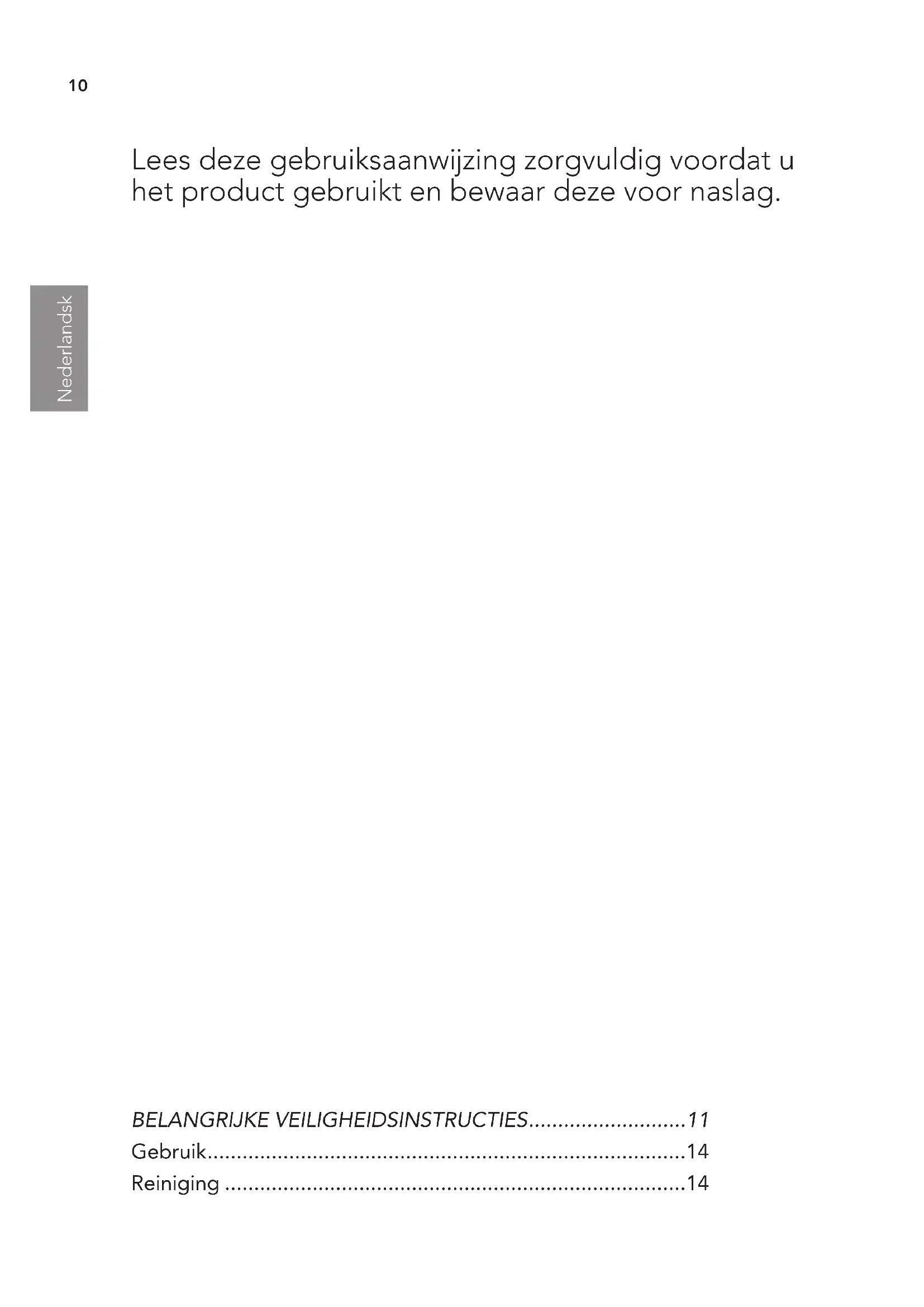 Gebruik ..................................................................................14 Reiniging ...............................................................................14 Lees deze gebruiksaanwijzing zorgvuldig voordat u het product gebruikt en bewaar deze voor naslag.Nederlandsk Nederlandsk