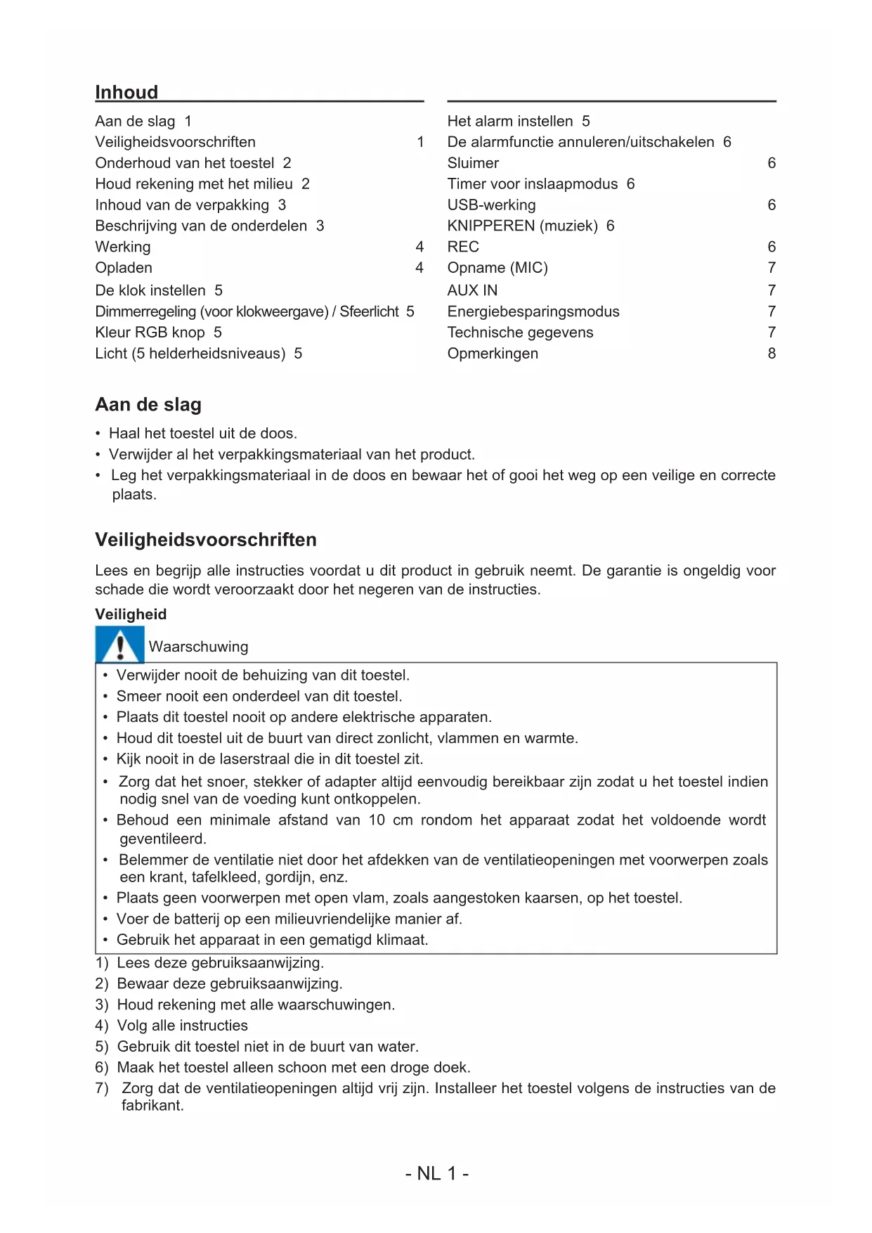 fabrikant. Aan de slag 1 Veiligheidsvoorschriften 1 Onderhoud van het toestel 2 Houd rekening met het milieu 2 Inhoud van de verpakking 3 Beschrijving van de onderdelen 3 Werking 4 Opladen 4 De klok instellen 5 Dimmerregeling (voor klokweergave) / Sfeerlicht 5 Kleur RGB knop 5 Licht (5 helderheidsniveaus) 5 Het alarm instellen 5 De alarmfunctie annuleren/uitschakelen 6 Sluimer 6 Timer voor inslaapmodus 6 USB-werking 6 KNIPPEREN (muziek) 6 REC: 6 Opname (MIC) 7 AUX IN 7 Energiebesparingsmodus 7 Technische gegevens: 7 Opmerkingen : 8 Inhoud- NL 2 -