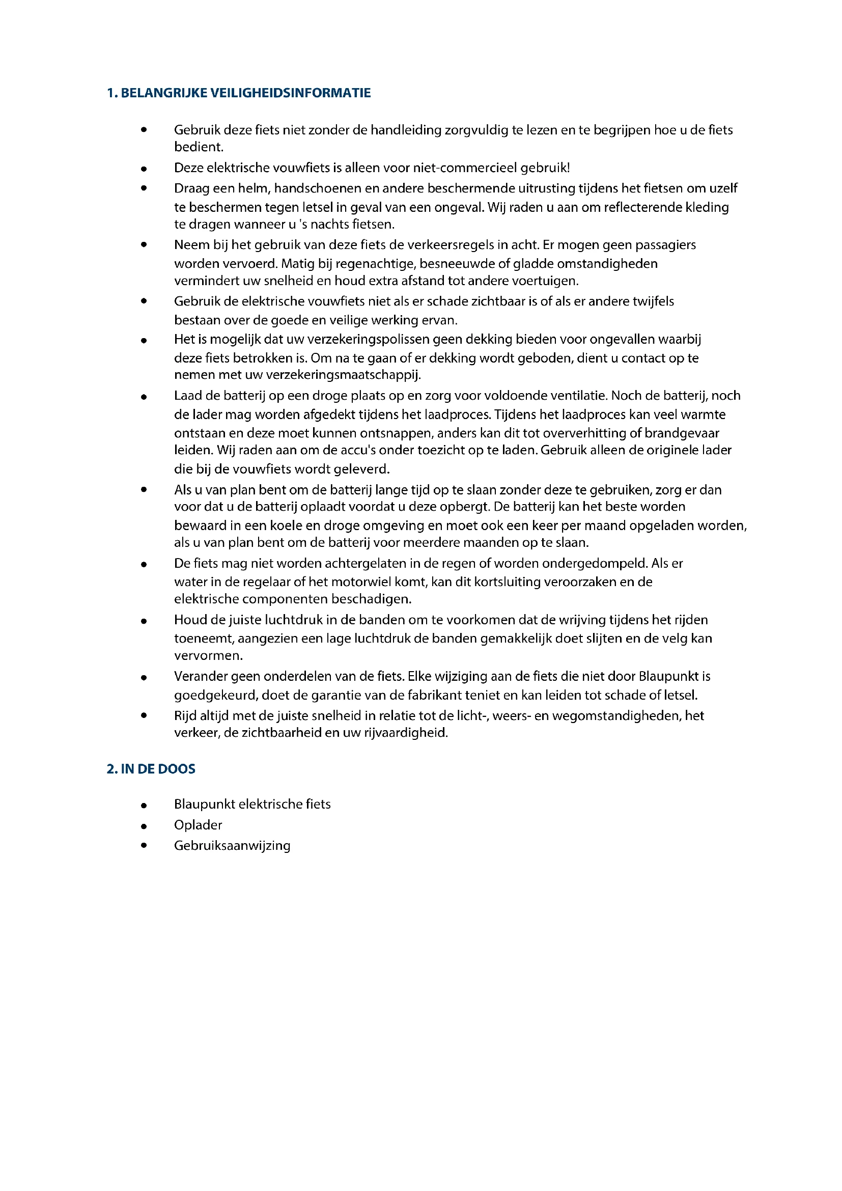 Salvo modifiche tecniche! Wij feliciteren u met de aankoop van uw nieuwe Blaupunkt elektrische vouwfiets. Wij willen graag dat u lang plezier beleeft aan uw elektrische fiets. Lees deze handleiding daarom aandachtig door. Als u, tegen de verwachting in, problemen heeft met de elektrische fiets, controleer dan met behulp van de handleiding of u deze kunt oplossen. Let op: Deze handleiding is geen gedetailleerde handleiding voor service, onderhoud en reparaties. Om de veiligheid van uw elektrische fiets te waarborgen, mogen reparaties alleen worden uitgevoerd door een specialist. Uw dealer en de Blaupunkt service helpen u graag verder. INHOUDSOPGAVE