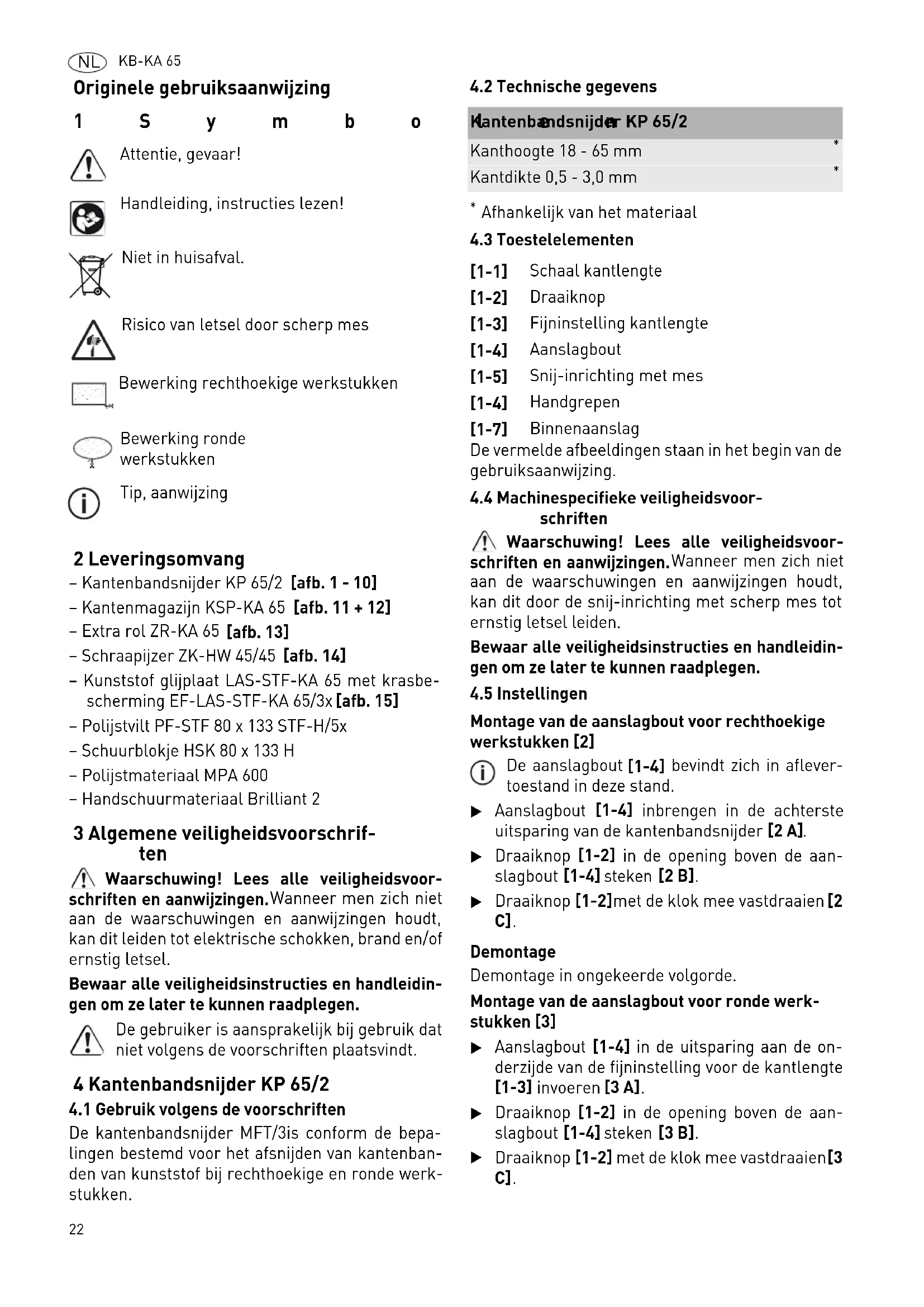 Attentie, gevaar! Handleiding, instructies lezen! Niet in huisafval. Risico van letsel door scherp mes Bewerking rechthoekige werkstukken Bewerking ronde werkstukken Tip, aanwijzing Kantenbandsnijder KP 65/2 Kanthoogte 18 - 65 mm
