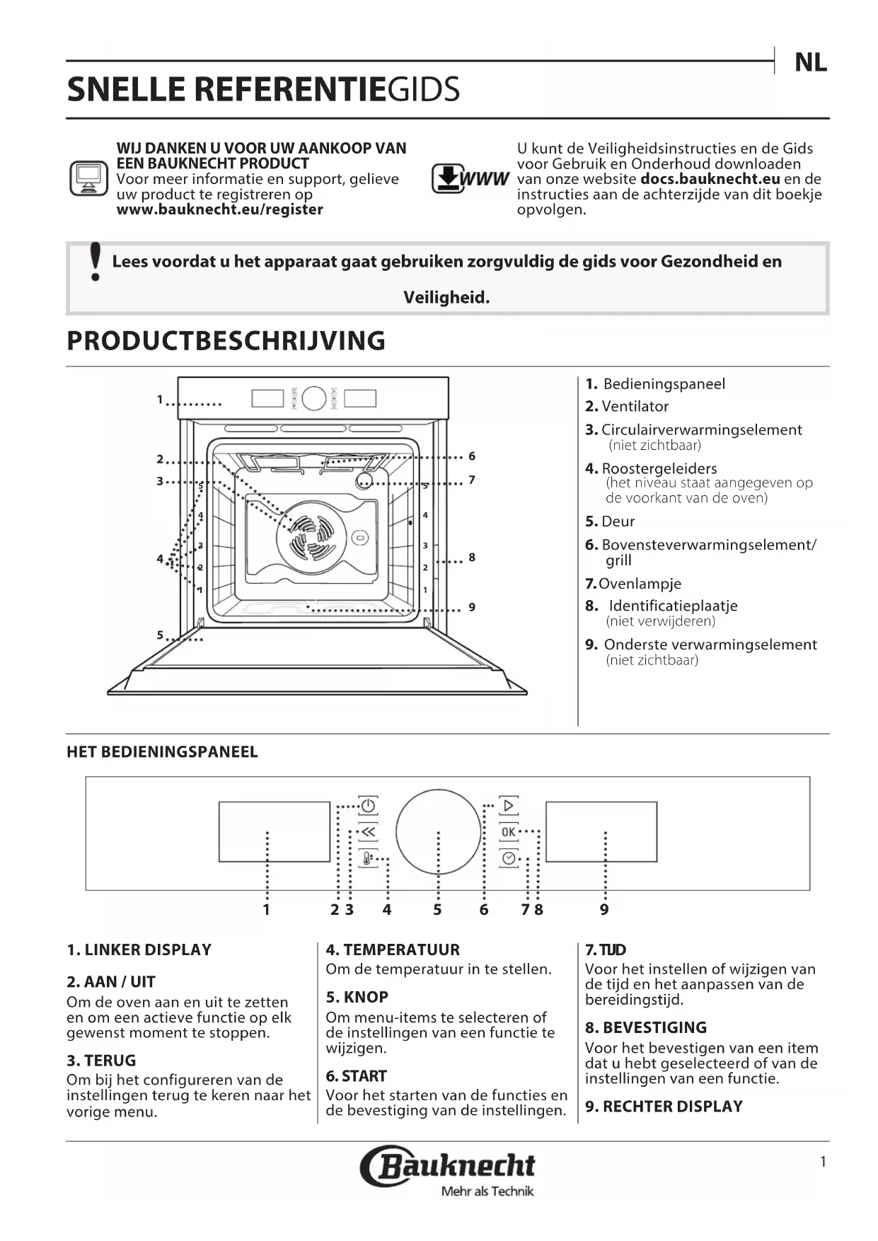 SNELLE REFERENTIEGIDS Lees voordat u het apparaat gaat gebruiken zorgvuldig de gids voor Gezondheid en Veiligheid. WIJ DANKEN U VOOR UW AANKOOP VAN EEN BAUKNECHT PRODUCTVoor meer informatie en support, gelieve uw product te registreren op www.bauknecht.eu/register WWW U kunt de Veiligheidsinstructies en de Gids voor Gebruik en Onderhoud downloaden van onze website docs.bauknecht.eu en de instructies aan de achterzijde van dit boekje opvolgen.