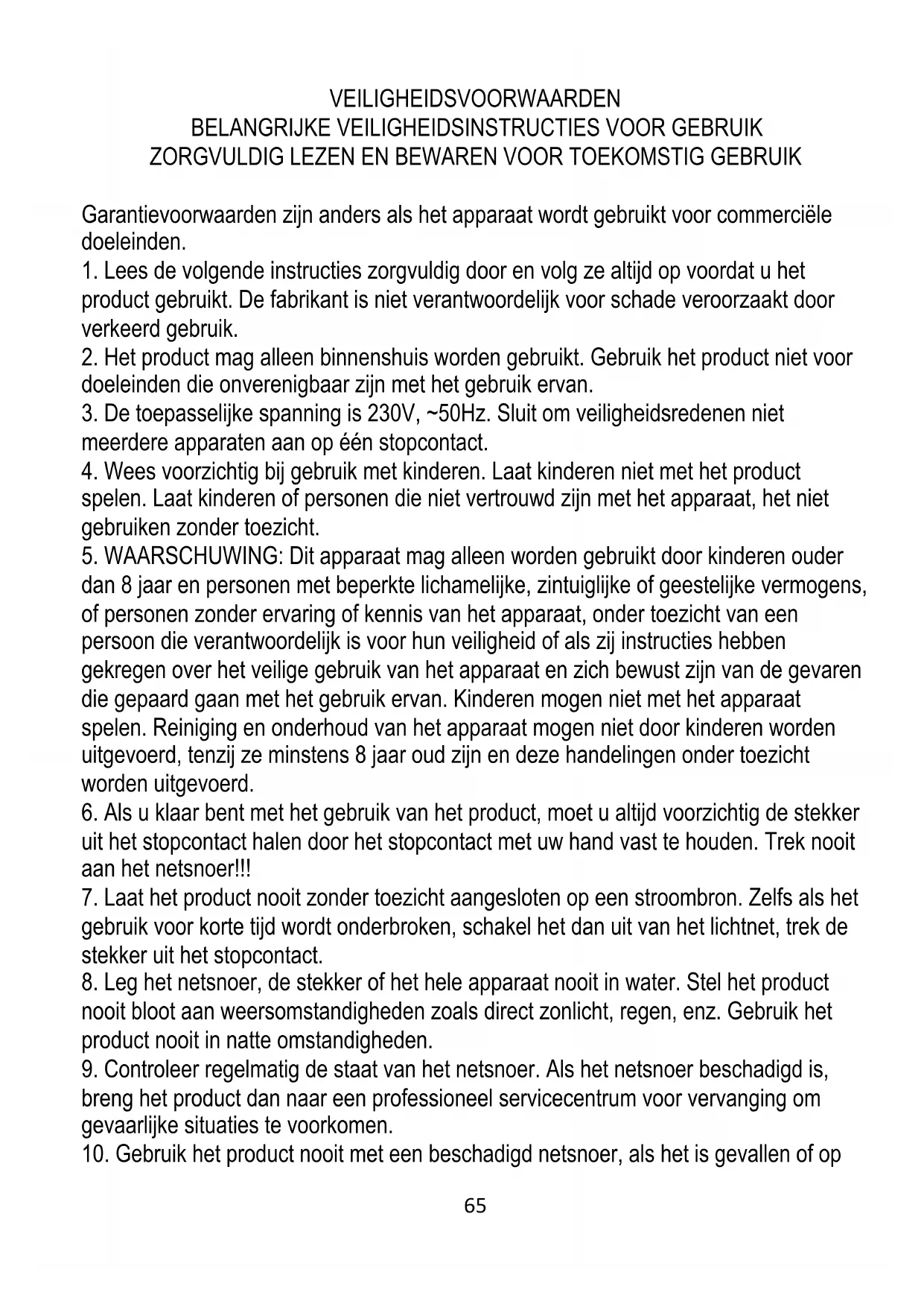 dan 8 jaar en personen met beperkte lichamelijke, zintuiglijke of geestelijke vermogens, of personen zonder ervaring of kennis van het apparaat, onder toezicht van een persoon die verantwoordelijk is voor hun veiligheid of als zij instructies hebben gekregen over het veilige gebruik van het apparaat en zich bewust zijn van de gevaren die gepaard gaan met het gebruik ervan. Kinderen mogen niet met het apparaat spelen. Reiniging en onderhoud van het apparaat mogen niet door kinderen worden uitgevoerd, tenzij ze minstens 8 jaar oud zijn en deze handelingen onder toezicht worden uitgevoerd.