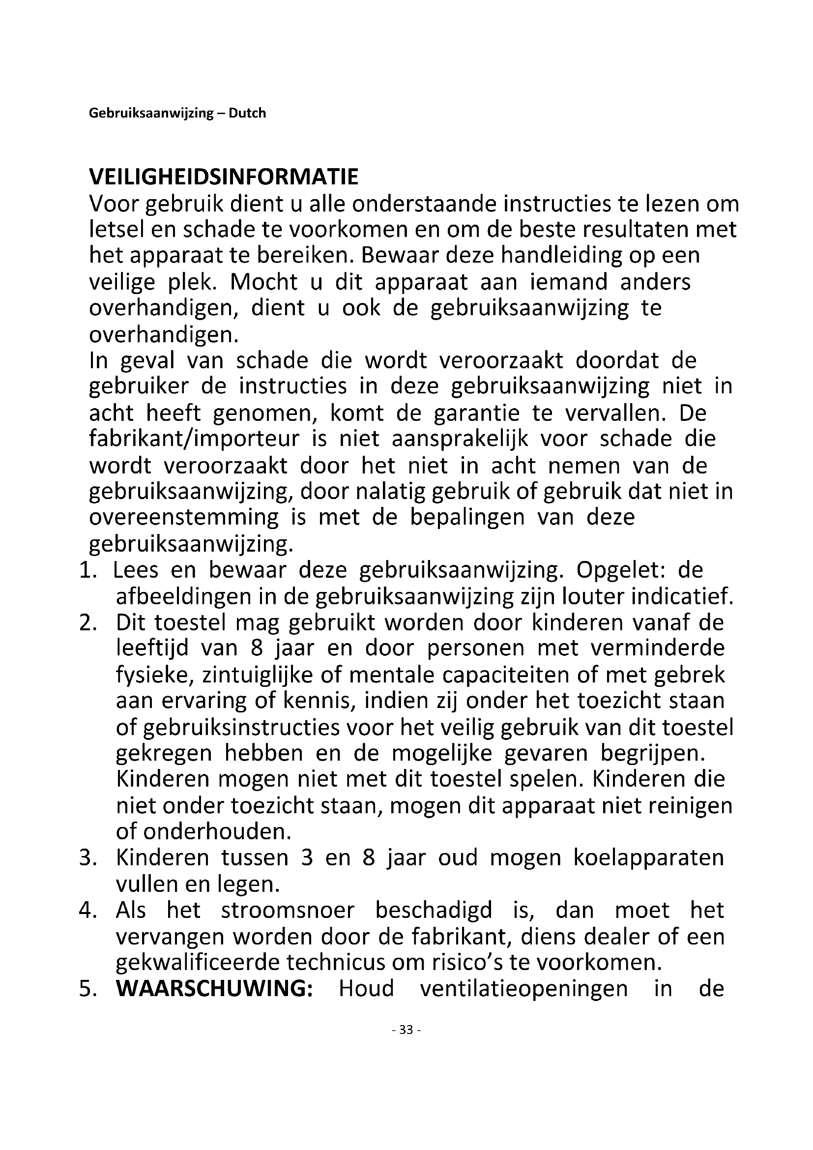 5. WAARSCHUWING: Houd ventilatieopeningen in de- 34 -