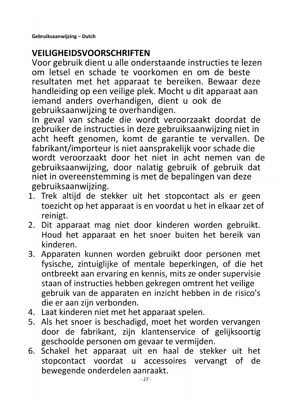 27. Gebruik nooit toebehoor, dat niet wordt aanbevolen door