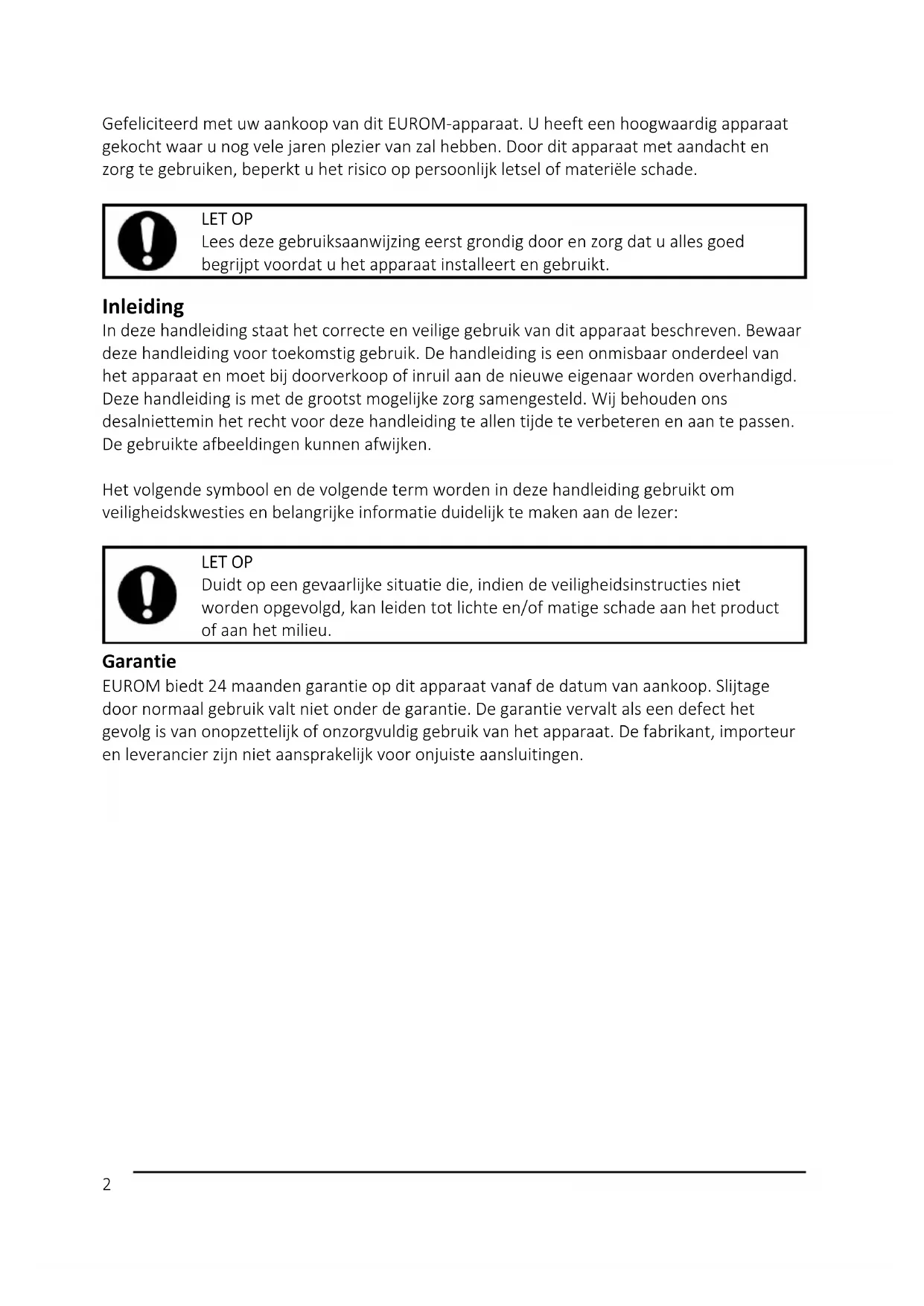 Verwijdering Gooi het apparaat aan het einde van de levensduur weg volgens de plaatselijke wetten en voorschriften of lever het apparaat in bij uw leverancier.8 Thank you for choosing this EUROM device. You have purchased a quality device that you will enjoy for many years. Using this device with respect and care will reduce the risk of personal injury or material damage.
