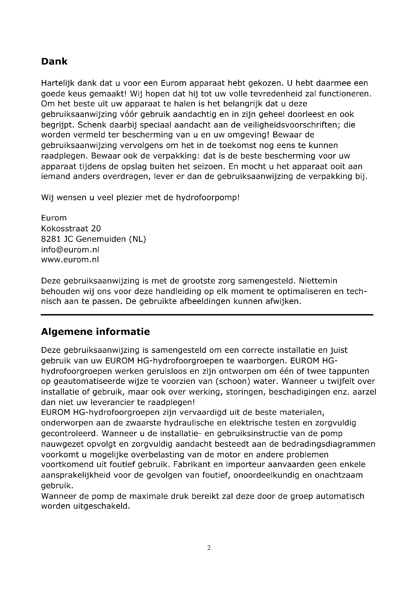 startinstellingen correct zijn. Wanneer er zich andere storingen voordoen dan hierboven vermeld, of wanneer de voorgestelde oplossingen het probleem niet verhelpen, wend u dan tot uw servicedienst.6 Verwijdering Binnen de EU betekent dit symbool dat dit product niet met het normale huishoudelijke afval mag worden afgevoerd. Afgedankte apparaten bevatten waardevolle materialen die hergebruikt kunnen en moeten worden, om het milieu en de gezondheid niet te schaden door ongereguleerde afvalinzameling. Breng afgedankte apparatuur daarom naar een daarvoor aangewezen inzamelpunt of wend u tot het bedrijf waar u het apparaat gekocht hebt. Zij kunnen er voor zorgen dat zoveel mogelijk onderdelen van het apparaat hergebruikt worden. CE-verklaring Zie pagina 39.7 Thank you Thank you very much for choosing for a Eurom device. You have made a good choice! We hope you will be satisfied about its functioning. To get maximum profit from your panel, it is important to read this manual attentive and totally before use, and to understand what is written. Read especially the safety instructions: they are there to protect you and your environment. Keep the manual in a safe place for future reference. Store also the package: that is the best protection for your heater in times of no-use. And if you at any time pass the appliance on, pass on the manual and package too. We wish you a lot of fun with the hydrophore unit! Eurom Kokosstraat 20 8281 JC Genemuiden (NL) info@eurom.nl www.eurom.nl This manual has been complied with the utmost care. Nevertheless, we reserve the right to optimize this manual at any time and to adjust it technically. The images used may differ.