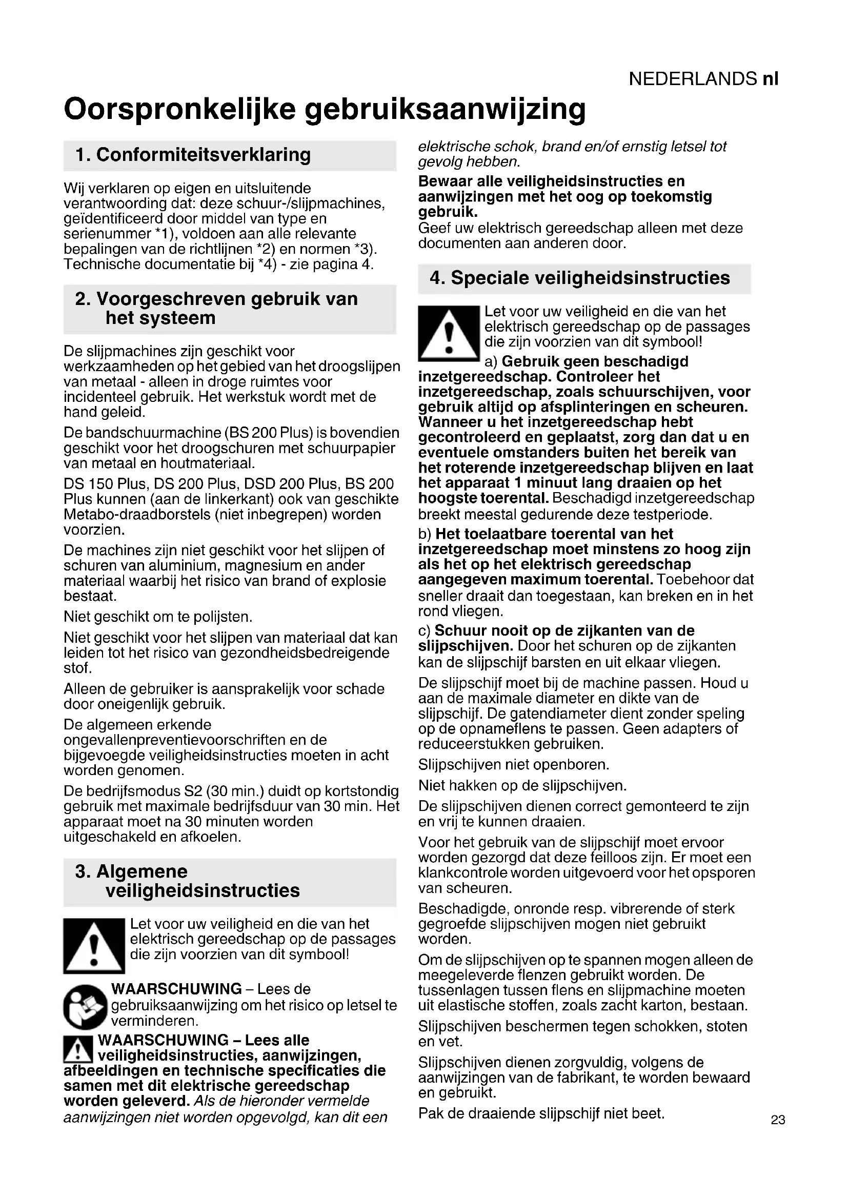 Oorspronkelijke gebruiksaanwijzing Wij verklaren op eigen en uitsluitende verantwoording dat: deze schuur-/slijpmachines, geïdentificeerd door middel van type en serienummer *1), voldoen aan alle relevante bepalingen van de richtlijnen *2) en normen *3). Technische documentatie bij *4) - zie pagina 4. De slijpmachines zijn geschikt voor werkzaamheden op het gebied van het droogslijpen van metaal - alleen in droge ruimtes voor incidenteel gebruik. Het werkstuk wordt met de hand geleid. De bandschuurmachine (BS 200 Plus) is bovendien geschikt voor het droogschuren met schuurpapier van metaal en houtmateriaal. DS 150 Plus, DS 200 Plus, DSD 200 Plus, BS 200 Plus kunnen (aan de linkerkant) ook van geschikte Metabo-draadborstels (niet inbegrepen) worden voorzien. De machines zijn niet geschikt voor het slijpen of schuren van aluminium, magnesium en ander materiaal waarbij het risico van brand of explosie bestaat. Niet geschikt om te polijsten. Niet geschikt voor het slijpen van materiaal dat kan leiden tot het risico van gezondheidsbedreigende stof. Alleen de gebruiker is aansprakelijk voor schade door oneigenlijk gebruik. De algemeen erkende ongevallenpreventievoorschriften en de bijgevoegde veiligheidsinstructies moeten in acht worden genomen. De bedrijfsmodus S2 (30 min.) duidt op kortstondig gebruik met maximale bedrijfsduur van 30 min. Het apparaat moet na 30 minuten worden uitgeschakeld en afkoelen. Let voor uw veiligheid en die van het elektrisch gereedschap op de passages die zijn voorzien van dit symbool! WAARSCHUWING – Lees de gebruiksaanwijzing om het risico op letsel te verminderen. WAARSCHUWING – Lees alle veiligheidsinstructies, aanwijzingen, afbeeldingen en technische specificaties die samen met dit elektrische gereedschap worden geleverd. Als de hieronder vermelde aanwijzingen niet worden opgevolgd, kan dit een elektrische schok, brand en/of ernstig letsel tot gevolg hebben. Bewaar alle veiligheidsinstructies en aanwijzingen met het oog op toekomstig gebruik. Geef uw elektrisch gereedschap alleen met deze documenten aan anderen door. Let voor uw veiligheid en die van het elektrisch gereedschap op de passages die zijn voorzien van dit symbool! a) Gebruik geen beschadigd inzetgereedschap. Controleer het inzetgereedschap, zoals schuurschijven, voor gebruik altijd op afsplinteringen en scheuren. Wanneer u het inzetgereedschap hebt gecontroleerd en geplaatst, zorg dan dat u en eventuele omstanders buiten het bereik van het roterende inzetgereedschap blijven en laat het apparaat 1 minuut lang draaien op het hoogste toerental. Beschadigd inzetgereedschap breekt meestal gedurende deze testperiode. b) Het toelaatbare toerental van het inzetgereedschap moet minstens zo hoog zijn als het op het elektrisch gereedschap aangegeven maximum toerental. Toebehoor dat sneller draait dan toegestaan, kan breken en in het rond vliegen. c) Schuur nooit op de zijkanten van de slijpschijven. Door het schuren op de zijkanten kan de slijpschijf barsten en uit elkaar vliegen. De slijpschijf moet bij de machine passen. Houd u aan de maximale diameter en dikte van de slijpschijf. De gatendiameter dient zonder speling op de opnameflens te passen. Geen adapters of reduceerstukken gebruiken. Slijpschijven niet openboren. Niet hakken op de slijpschijven. De slijpschijven dienen correct gemonteerd te zijn en vrij te kunnen draaien. Voor het gebruik van de slijpschijf moet ervoor worden gezorgd dat deze feilloos zijn. Er moet een klankcontrole worden uitgevoerd voor het opsporen van scheuren. Beschadigde, onronde resp. vibrerende of sterk gegroefde slijpschijven mogen niet gebruikt worden. Om de slijpschijven op te spannen mogen alleen de meegeleverde flenzen gebruikt worden. De tussenlagen tussen flens en slijpmachine moeten uit elastische stoffen, zoals zacht karton, bestaan. Slijpschijven beschermen tegen schokken, stoten en vet. Slijpschijven dienen zorgvuldig, volgens de aanwijzingen van de fabrikant, te worden bewaard en gebruikt. Pak de draaiende slijpschijf niet beet.