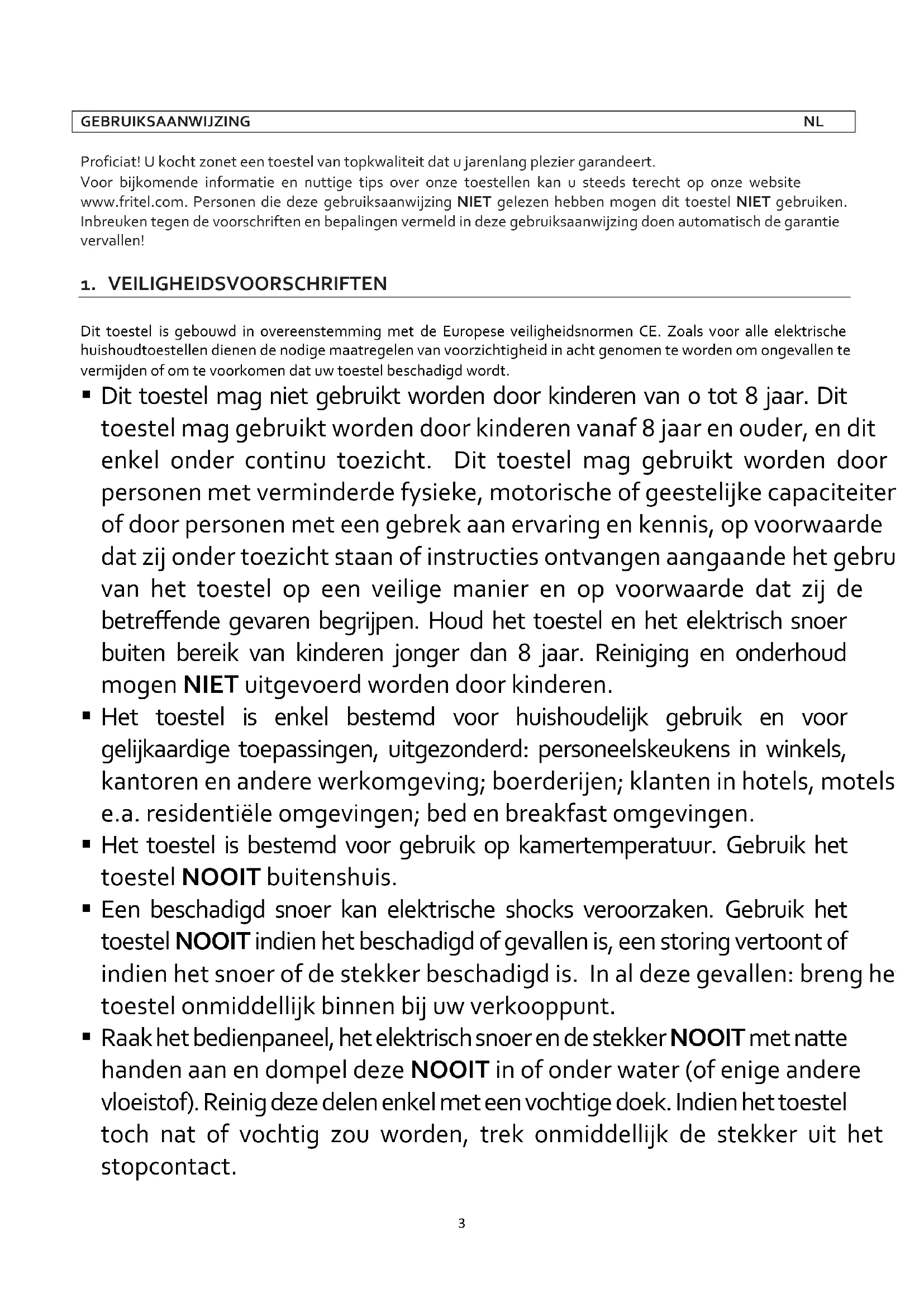 Het typenummer en wattage van uw toestel staan vermeld op het typeplaatje. Le n° de type et le wattage de votre appareil sont mentionnés sur la plaque signalétique. The type nr. and watt power of the appliance are mentioned on the rating label. Die Typennr. und Leistung des Gerätes sind auf dem Typenschild angegeben.3 GEBRUIKSAANWIJZING NL Proficiat! U kocht zonet een toestel van topkwaliteit dat u jarenlang plezier garandeert. Voor bijkomende informatie en nuttige tips over onze toestellen kan u steeds terecht op onze website www.fritel.com. Personen die deze gebruiksaanwijzing NIET gelezen hebben mogen dit toestel NIET gebruiken. Inbreuken tegen de voorschriften en bepalingen vermeld in deze gebruiksaanwijzing doen automatisch de garantie vervallen!