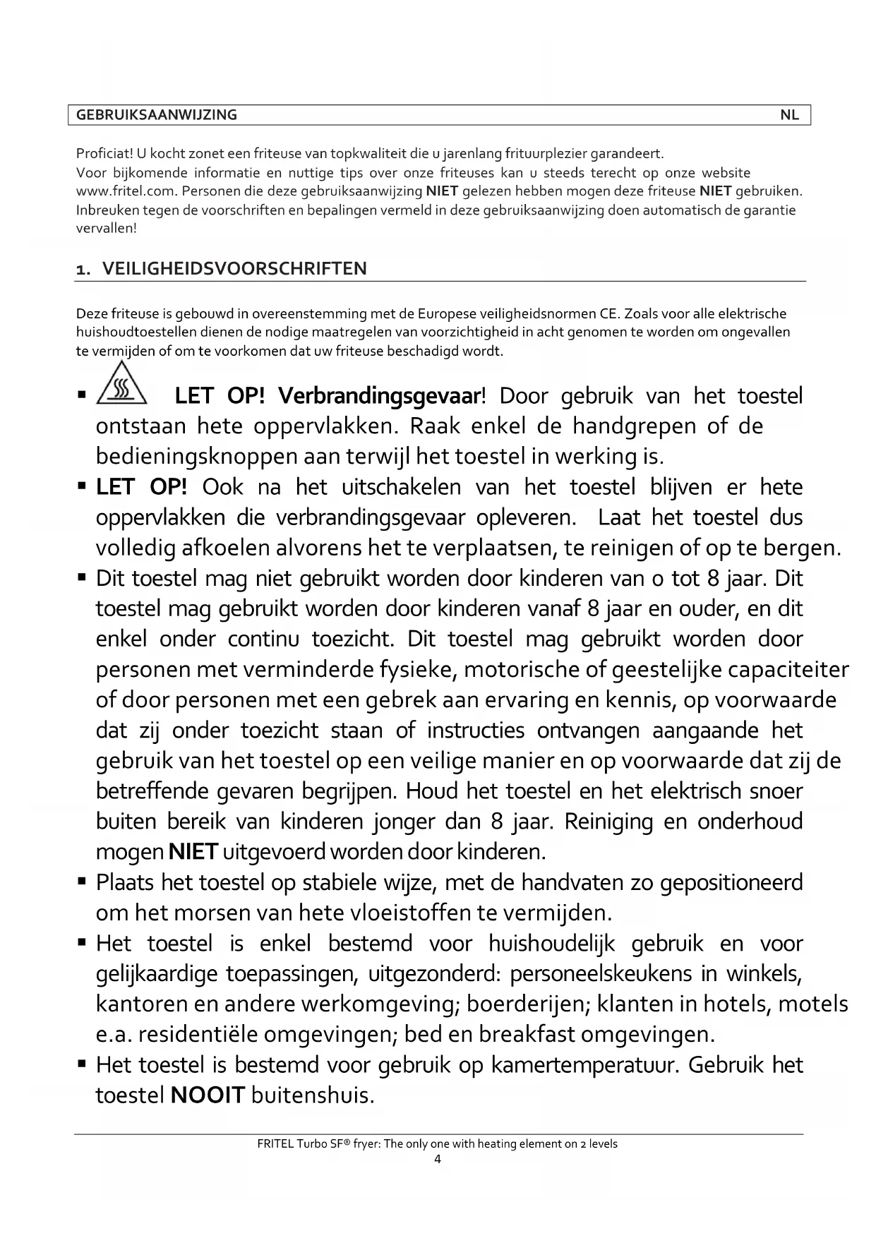 GEBRUIKSAANWIJZING NL Proficiat! U kocht zonet een friteuse van topkwaliteit die u jarenlang frituurplezier garandeert. Voor bijkomende informatie en nuttige tips over onze friteuses kan u steeds terecht op onze website www.fritel.com. Personen die deze gebruiksaanwijzing NIET gelezen hebben mogen deze friteuse NIET gebruiken. Inbreuken tegen de voorschriften en bepalingen vermeld in deze gebruiksaanwijzing doen automatisch de garantie vervallen!