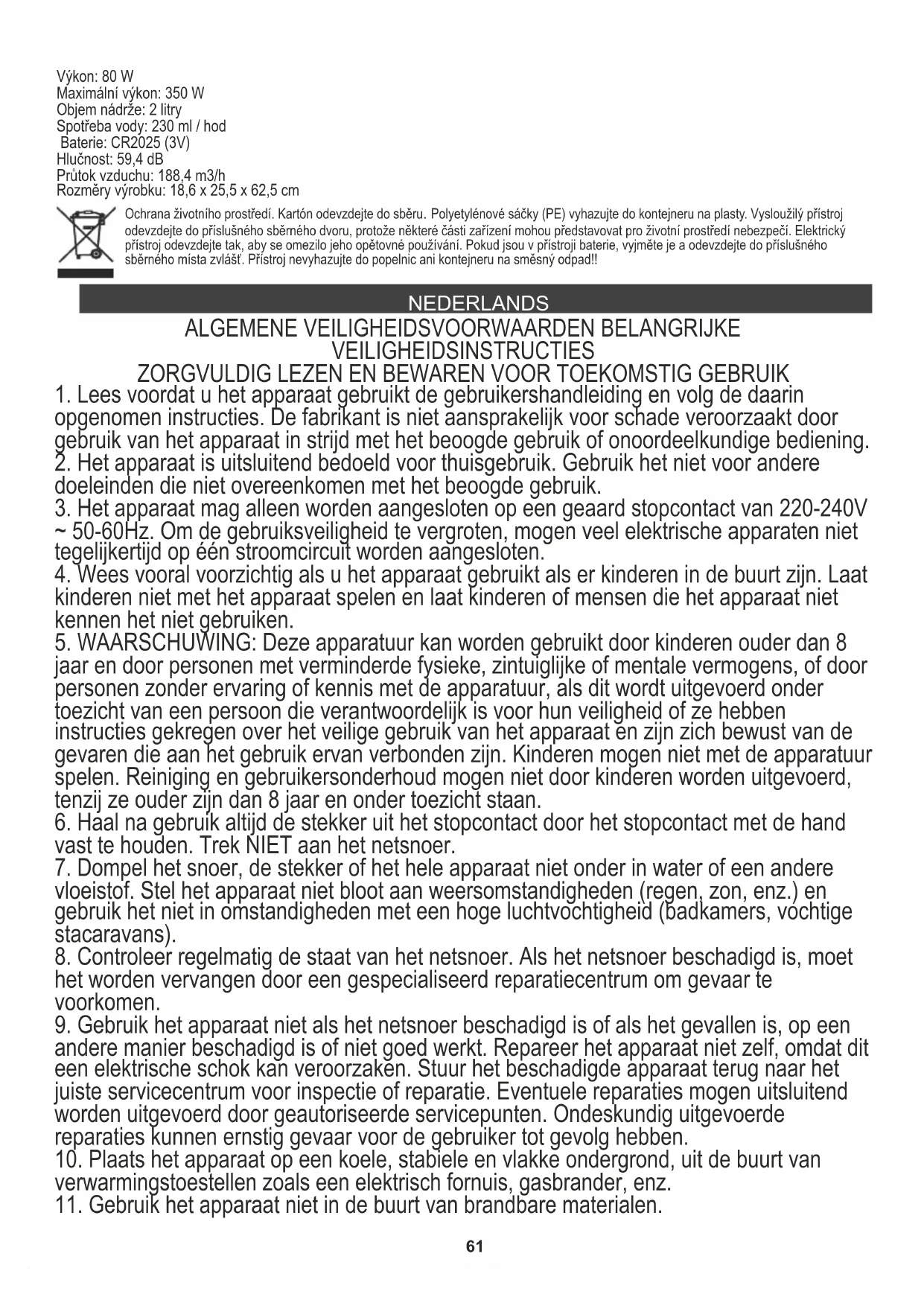 TECHNISCHE DATA: Voeding 220-240V ~50-60 Hz Vermogen: 80 W Maximaal vermogen: 350 W Tankinhoud: 2 liter Waterverbruik: 230 ml / uur Batterij: CR2025 (3V) Geluidsniveau: 59,4dB Luchtstroomvolume: 188,4m3/h Productafmetingen: 18,6 x 25,5 x 62,5 cm We geven om het milieu. We vragen u om de kartonnen verpakkingen te storten bij het oud papier. Polyethyleen zakken (PE) storten in de container voor plastic . Versleten apparatuur afgeven bij het juiste verzamelpunkt, als in het apparatuur gevaarlijke elementen zitten kan dat een bedreiging zijn voor het milieu. Elektrisch apparatuur moet worden geretourneerd om het hergebruik te verminderen. Als in het apparatur batterijen ziiten, horen die verwijderd te worden en appart af te worden gegeven bij het juiste verzamelpunkt.