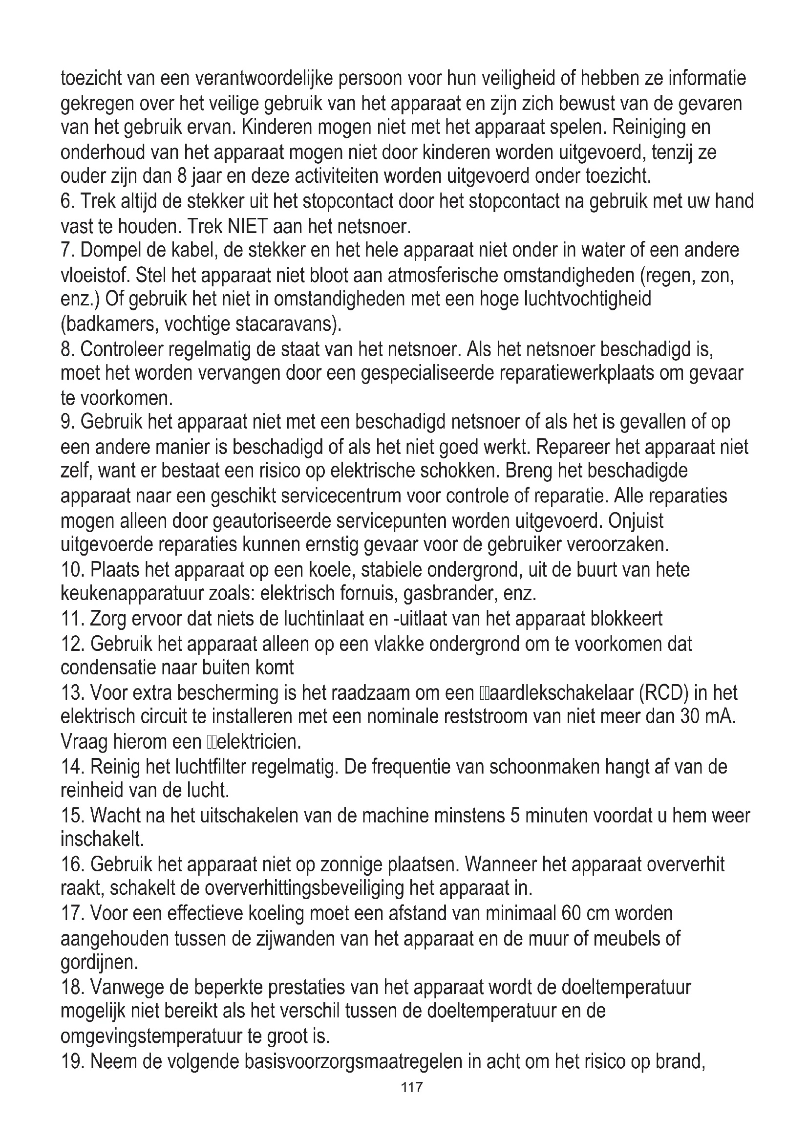21. Het apparaat moet worden opgeslagen in een ruimte zonder constant werkende