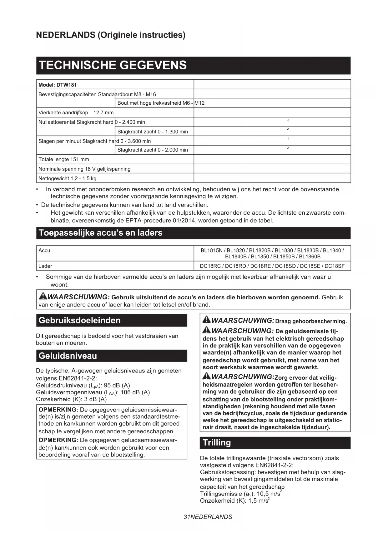 - Sommigevandehierbovenvermeldeaccu’senladerszijnmogelijknietleverbaarafhankelijkvanwaaru woont. WAARSCHUWING: Gebruik uitsluitend de accu’s en laders die hierboven worden genoemd. Gebruik van enige andere accu of lader kan leiden tot letsel en/of brand. Gebruiksdoeleinden Dit gereedschap is bedoeld voor het vastdraaien van bouten en moeren. Geluidsniveau Detypische,A-gewogengeluidsniveauszijngemeten volgens EN62841-2-2: Geluidsdrukniveau(L