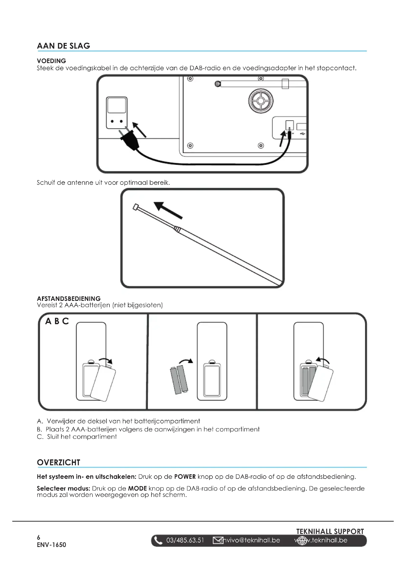 VOEDING Steek de voedingskabel in de achterzijde van de DAB-radio en de voedingsadapter in het stopcontact. Schuif de antenne uit voor optimaal bereik. AFSTANDSBEDIENING Vereist 2 AAA-batterijen (niet bijgesloten) A B C A. Verwijder de deksel van het batterijcompartiment B. Plaats 2 AAA-batterijen volgens de aanwijzingen in het compartiment C. Sluit het compartiment OVERZICHT Het systeem in- en uitschakelen: Druk op de POWER knop op de DAB-radio of op de afstandsbediening. Selecteer modus: Druk op de MODE knop op de DAB-radio of op de afstandsbediening. De geselecteerde modus zal worden weergegeven op het scherm.ENV-1650