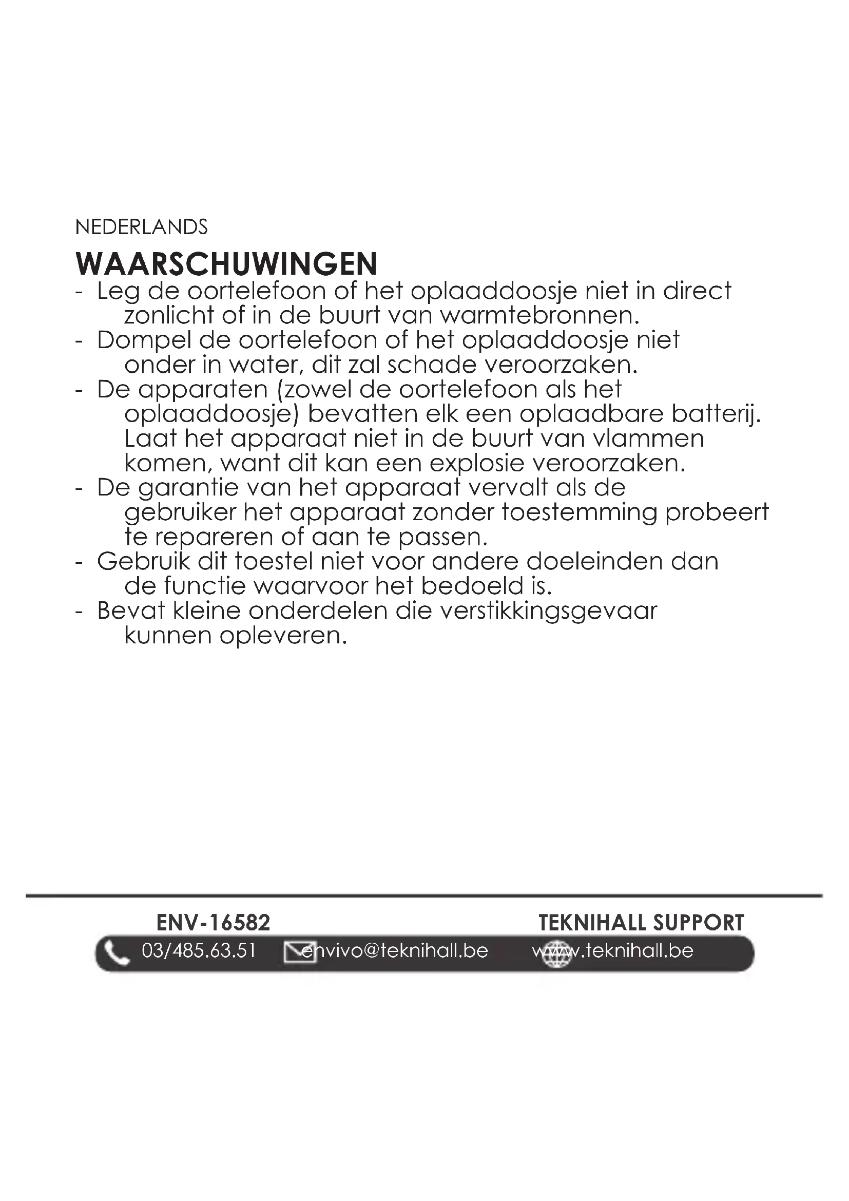 03/485.63.51 envivo@teknihall.be www.teknihall.be TEKNIHALL SUPPORT WAARSCHUWINGEN - Leg de oortelefoon of het oplaaddoosje niet in direct zonlicht of in de buurt van warmtebronnen. - Dompel de oortelefoon of het oplaaddoosje niet onder in water, dit zal schade veroorzaken. - De apparaten (zowel de oortelefoon als het oplaaddoosje) bevatten elk een oplaadbare batterij. Laat het apparaat niet in de buurt van vlammen komen, want dit kan een explosie veroorzaken. - De garantie van het apparaat vervalt als de gebruiker het apparaat zonder toestemming probeert te repareren of aan te passen. - Gebruik dit toestel niet voor andere doeleinden dan de functie waarvoor het bedoeld is. - Bevat kleine onderdelen die verstikkingsgevaar kunnen opleveren. NEDERLANDSENV-1658 3 03/485.63.51 envivo@teknihall.be www.teknihall.be TEKNIHALL SUPPORT Dit product bevat magnetisch materiaal. Vraag uw dokter of dit van invloed kan zijn op uw geïmplanteerde medische apparaat. LUISTERVEILIGHEID Gevaar - Luister niet voor lange tijd op een hoog volume om gehoorbeschadiging te voorkomen. Zet het volume op een veilig niveau. Als het volume van de oortelefoon te hoog is, dient de gebruikstijd te worden verkort. NEDERLANDSENV-16584 03/485.63.51 envivo@teknihall.be www.teknihall.be TEKNIHALL SUPPORT PRODUCTSPECIFICATIES Bereik: 10 meter (zonder obstakels) Stijl: TWS Speelduur: 8 uur (6-8 uur met ANC AAN) Beltijd: 5 uur Oplaadtijd: 1,5 uur Gevoeligheid: 102,7 + 1,5 dB Vervorming: < 0,1% Frequentiebereik: 2402 MHz - 2480 MHz Maximaal zendvermogen minder dan 12 dBm EIRP. ANC-functie: -25 dB tot -27 dB Latentie gamingmodus: 60 - 80 ms Waterbestendigheid oortelefoons: IPX4 Batterijtype oortelefoon en oplaaddoosje: Li-ion-polymeerbatterij Batterij oortelefoon: 3,7 V / 40 mAh, 0,148 Wu Batterij oplaaddoosje: 3,7 V / 300 mAh, 1,11 Wu Koppelingsnaam: ENV-1658
