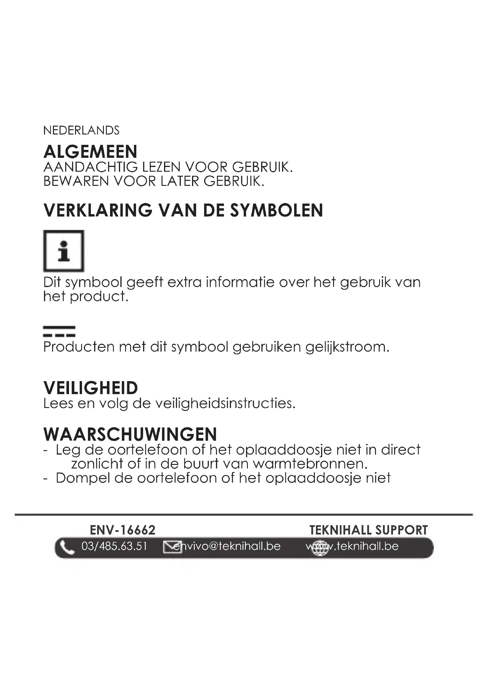 Dit symbool geeft extra informatie over het gebruik van het product. Producten met dit symbool gebruiken gelijkstroom. VEILIGHEID Lees en volg de veiligheidsinstructies. WAARSCHUWINGEN - Leg de oortelefoon of het oplaaddoosje niet in direct zonlicht of in de buurt van warmtebronnen. - Dompel de oortelefoon of het oplaaddoosje nietENV-1666 3 03/485.63.51 envivo@teknihall.be www.teknihall.be TEKNIHALL SUPPORT NEDERLANDS onder in water, dit zal schade veroorzaken. - De apparaten (zowel de oortelefoon als het oplaaddoosje) bevatten elk een oplaadbare batterij. Laat het apparaat niet in de buurt van vlammen komen, want dit kan een explosie veroorzaken. - De garantie van het apparaat vervalt als de gebruiker het apparaat zonder toestemming probeert te repareren of aan te passen. - Gebruik dit toestel niet voor andere doeleinden dan de functie waarvoor het bedoeld is. - Bevat kleine onderdelen die verstikkingsgevaar kunnen opleveren.