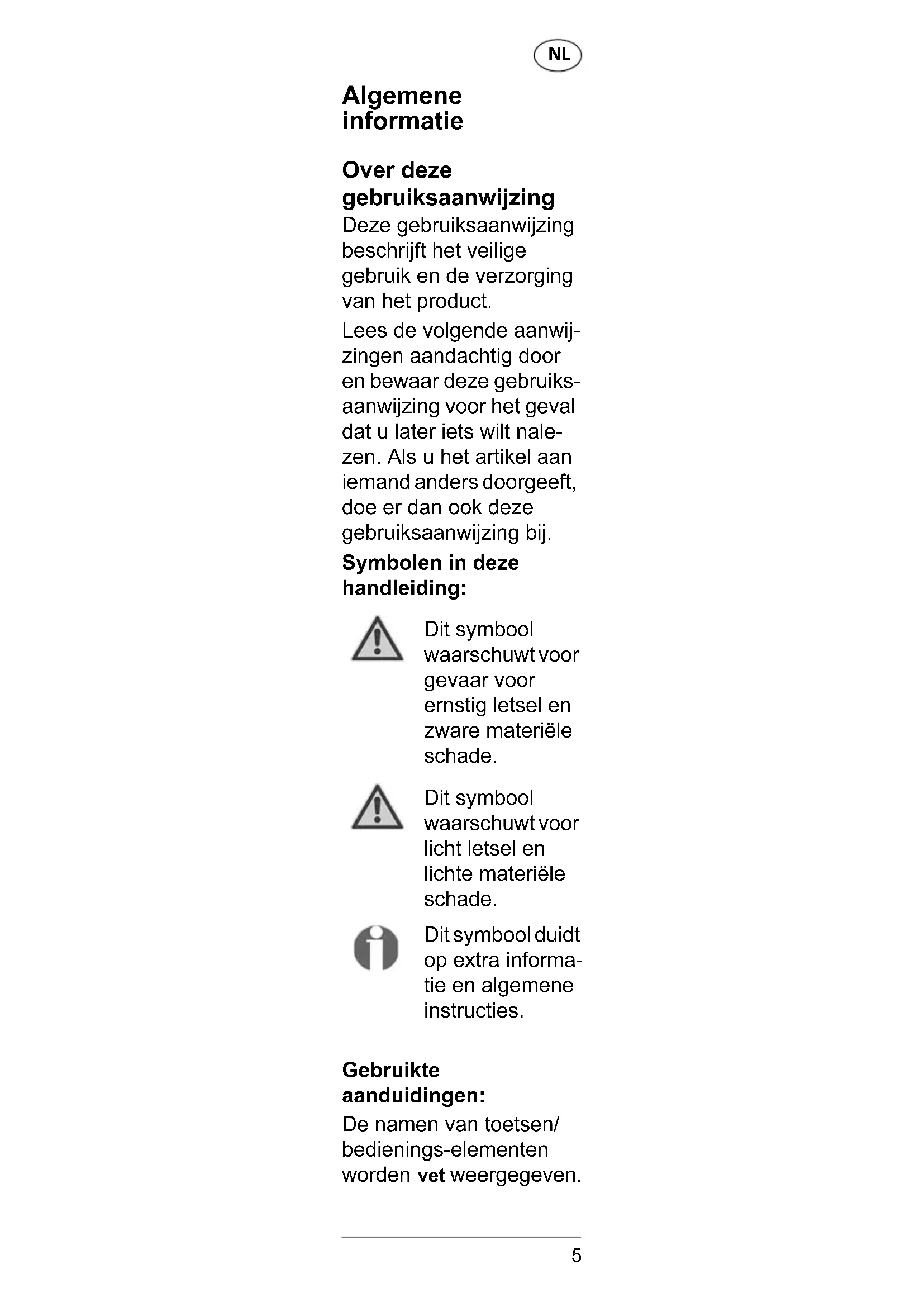 Algemene informatie Over deze gebruiksaanwijzing Deze gebruiksaanwijzing beschrijft het veilige gebruik en de verzorging van het product. Lees de volgende aanwij- zingen aandachtig door en bewaar deze gebruiks- aanwijzing voor het geval dat u later iets wilt nale- zen. Als u het artikel aan iemand anders doorgeeft, doe er dan ook deze gebruiksaanwijzing bij. Symbolen in deze handleiding: Dit symbool waarschuwt voor gevaar voor ernstig letsel en zware materiële schade. Dit symbool waarschuwt voor licht letsel en lichte materiële schade. Dit symbool duidt op extra informa- tie en algemene instructies. Gebruikte aanduidingen: De namen van toetsen/ bedienings-elementen worden vet weergegeven. Druckbuch HH Thermometer BEL.book Seite 5 Mittwoch, 22. Juli 2015 9:41 09NL