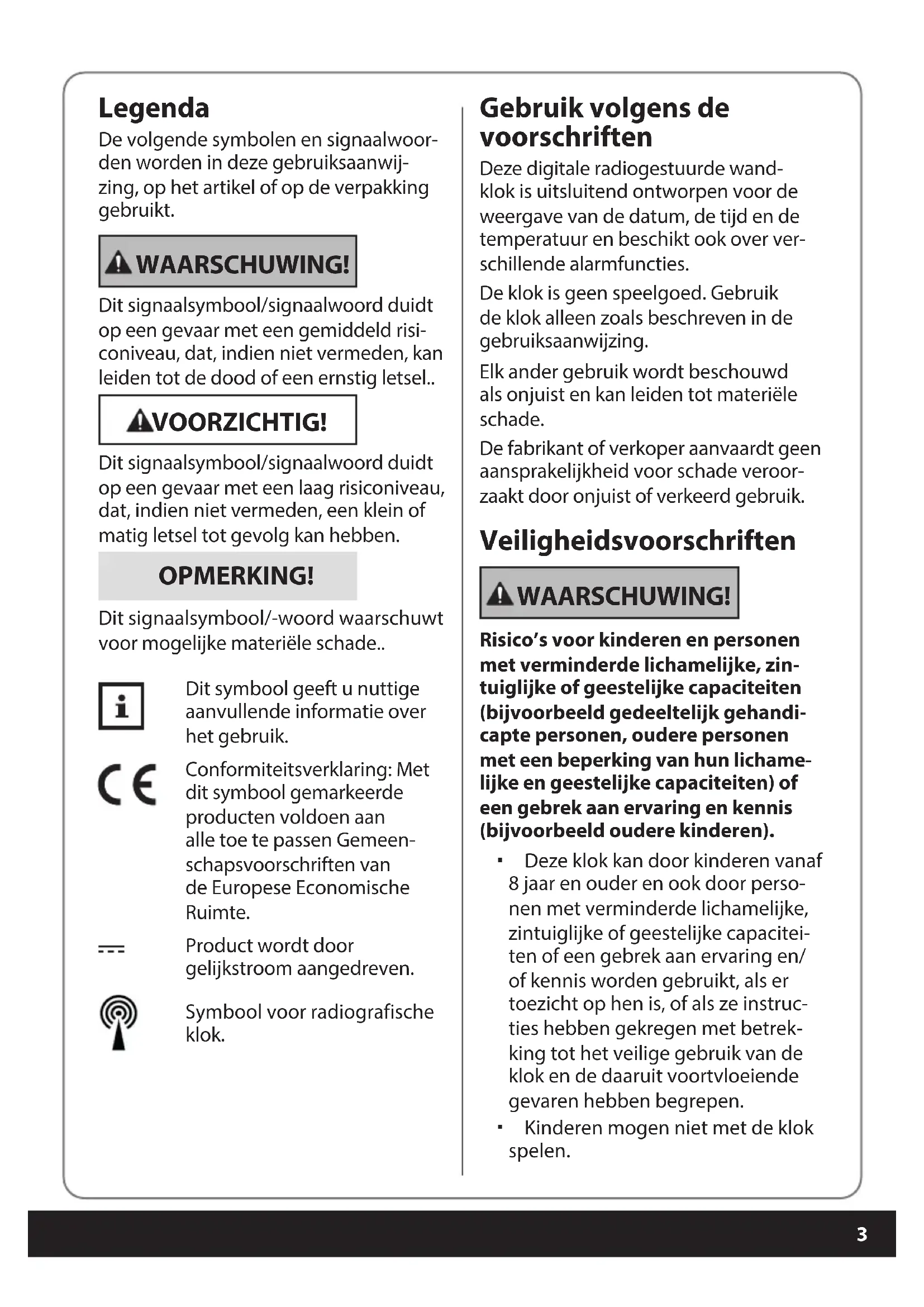 Legenda De volgende symbolen en signaalwoor- den worden in deze gebruiksaanwij- zing, op het artikel of op de verpakking gebruikt. WAARSCHUWING! Dit signaalsymbool/signaalwoord duidt op een gevaar met een gemiddeld risi- coniveau, dat, indien niet vermeden, kan leiden tot de dood of een ernstig letsel.. VOORZICHTIG! Dit signaalsymbool/signaalwoord duidt op een gevaar met een laag risiconiveau, dat, indien niet vermeden, een klein of matig letsel tot gevolg kan hebben. OPMERKING! Dit signaalsymbool/-woord waarschuwt voor mogelijke materiële schade.. Dit symbool geeft u nuttige aanvullende informatie over het gebruik. Conformiteitsverklaring: Met dit symbool gemarkeerde producten voldoen aan alle toe te passen Gemeen- schapsvoorschriften van de Europese Economische Ruimte. Product wordt door gelijkstroom aangedreven. Symbool voor radiografische klok. Gebruik volgens de voorschriften Deze digitale radiogestuurde wand- klok is uitsluitend ontworpen voor de weergave van de datum, de tijd en de temperatuur en beschikt ook over ver- schillende alarmfuncties. De klok is geen speelgoed. Gebruik de klok alleen zoals beschreven in de gebruiksaanwijzing. Elk ander gebruik wordt beschouwd als onjuist en kan leiden tot materiële schade. De fabrikant of verkoper aanvaardt geen aansprakelijkheid voor schade veroor- zaakt door onjuist of verkeerd gebruik. Veiligheidsvoorschriften WAARSCHUWING! Risico’s voor kinderen en personen met verminderde lichamelijke, zin- tuiglijke of geestelijke capaciteiten (bijvoorbeeld gedeeltelijk gehandi- capte personen, oudere personen met een beperking van hun lichame- lijke en geestelijke capaciteiten) of een gebrek aan ervaring en kennis (bijvoorbeeld oudere kinderen). Deze klok kan door kinderen vanaf 8 jaar en ouder en ook door perso- nen met verminderde lichamelijke, zintuiglijke of geestelijke capacitei- ten of een gebrek aan ervaring en/ of kennis worden gebruikt, als er toezicht op hen is, of als ze instruc- ties hebben gekregen met betrek- king tot het veilige gebruik van de klok en de daaruit voortvloeiende gevaren hebben begrepen. Kinderen mogen niet met de klok spelen. Druckbuch BEL.indb 3Druckbuch BEL.indb 3 16.04.2021 13:54:4616.04.2021 13:54:464 Reiniging en onderhoud door de gebruiker mogen niet door kinde- ren worden uitgevoerd als er geen toezicht op hen is. Laat kinderen niet spelen met verpakkingsmateriaal, maar gooi het onmiddellijk weg. VOORZICHTIG! Explosie- en verbrandingsgevaar door zuur! Onjuist omgaan met de batterij kan lei- den tot letsels. Alleen vervanging door hetzelfde of een gelijkwaardig type (zie “Techni- sche specicaties”). Laad de batterijen niet opnieuw op en reactiveer de batterijen ook niet met andere middelen. Let bij het plaatsen van de batterijen op de juiste polariteit (+/-). Reinig indien nodig de batterij- en apparaatcontacten. Haal batterijen niet uit elkaar en bewaar de batterij op een koele, droge plaats. Laat de batterijen niet kortsluiten. Stel de batterijen niet bloot aan overmatige hitte (bijvoorbeeld direct zonlicht) en gooi ze niet in vuur. Bewaar de batterij niet in een omgeving met een zeer lage lucht- druk. Als het batterijvak niet meer veilig kan afgesloten worden, de klok niet meer gebruiken. Vermijd contact van batterijvloeistof met huid, ogen en slijmvliezen. Bij contact dient u de getroen gebie- den overvloedig met veel helder water te spoelen en onmiddellijk een arts te raadplegen. Batterijen kunnen levensgevaar- lijk zijn. Bewaar batterijen daarom onbereikbaar voor kleine kinderen. Indien een batterij werd ingeslikt of op een andere manier in een lichaam terechtkomt, dient u onmid- dellijk een arts te raadplegen. Haal lege batterijen uit het batterij- vak. Het risico bestaat dat batterij- vloeistof gaat lekken. Verwijder de batterij ook: - als u het artikel langere tijd niet gaat gebruiken, - voor u het artikel afvoert. OPMERKING! Gevaar voor schade! Oneigenlijk gebruik van de wekker kan leiden tot beschadigingen. Bescherm de klok tegen extreme hitte, zonlicht, stof, magnetische velden, chemicaliën en mechanische slijtage. Plaats de klok niet in de onmiddel- lijke nabijheid van open vuur zoals kaarsen. Laat het horloge niet vallen en stel het niet bloot aan sterke slagen. Dompel de klok niet onder in water of andere vloeistoen en bescherm ze tegen vocht. Inhoud van de levering Radiogestuurde wandklok 2x batterij LR03/R03 (AAA) Gebruiksaanwijzing Druckbuch BEL.indb 4Druckbuch BEL.indb 4 16.04.2021 13:54:4616.04.2021 13:54:46Onderdelen en bedieningselementen Display 1 Seconden 2 Weergave zomertijd (DST) 3 Weergave radiosymbool 4 Weergave AM/PM 5 Uren 6 Minuten 7 Sluimerweergave* 8 Maanfase 9 Tijdzonesymbool 10 Alarmsymbool 11 Batterijniveau-indicator 12 Dag/maand ** 13 Maand/dag **