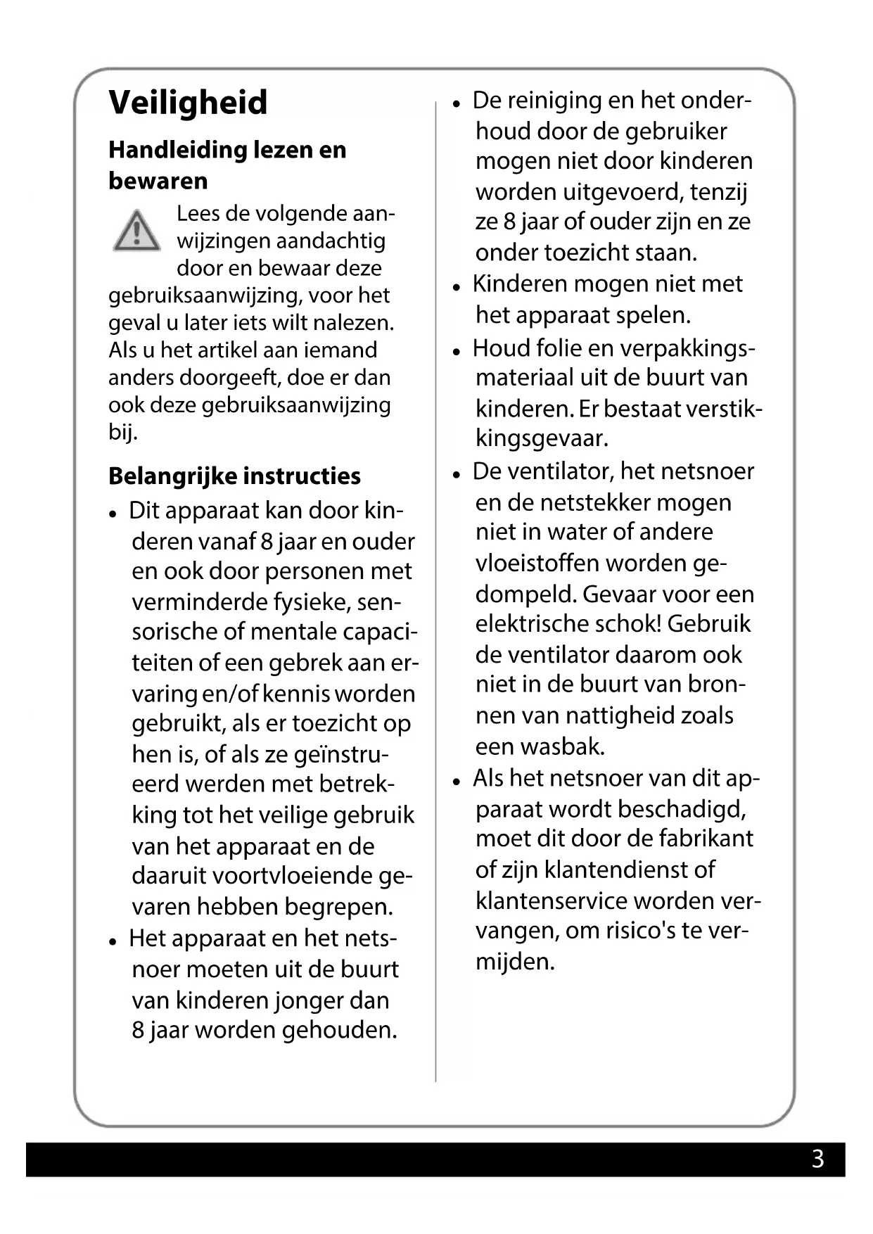 - Afvoer Veiligheid Handleiding lezen en bewaren Lees de volgende aan- wijzingen aandachtig door en bewaar deze gebruiksaanwijzing, voor het geval u later iets wilt nalezen. Als u het artikel aan iemand anders doorgeeft, doe er dan ook deze gebruiksaanwijzing bij. Belangrijke instructies z Dit apparaat kan door kin- deren vanaf 8 jaar en ouder en ook door personen met verminderde fysieke, sen- sorische of mentale capaci- teiten of een gebrek aan er- varing en/of kennis worden gebruikt, als er toezicht op hen is, of als ze geïnstru- eerd werden met betrek- king tot het veilige gebruik van het apparaat en de daaruit voortvloeiende ge- varen hebben begrepen. z Het apparaat en het nets- noer moeten uit de buurt van kinderen jonger dan 8 jaar worden gehouden. z De reiniging en het onder- houd door de gebruiker mogen niet door kinderen worden uitgevoerd, tenzij ze 8 jaar of ouder zijn en ze onder toezicht staan. z Kinderen mogen niet met het apparaat spelen. z Houd folie en verpakkings- materiaal uit de buurt van kinderen. Er bestaat verstik- kingsgevaar. z De ventilator, het netsnoer en de netstekker mogen niet in water of andere vloeistoffen worden ge- dompeld. Gevaar voor een elektrische schok! Gebruik de ventilator daarom ook niet in de buurt van bron- nen van nattigheid zoals een wasbak. z Als het netsnoer van dit ap- paraat wordt beschadigd, moet dit door de fabrikant of zijn klantendienst of klantenservice worden ver- vangen, om risico's te ver- mijden.4 z De ventilator mag niet op een tijdschakelklok, een schemeringsschakelaar of op een ander op afstand werkend systeem worden aangesloten. Voorschriftmatig gebruik z De ventilator is uitsluitend ontwor- pen voor de ventilatie van droge ruimtes. z Deze is uitsluitend bedoeld voor privégebruik en is niet geschikt voor zakelijk gebruik. Gevaar door elektriciteit z Bedien het apparaat niet met natte handen. z Gebruik het apparaat niet in de openlucht. z Sluit het apparaat aan op een naar behoren geïnstalleerd stopcontact met randaarding, waarvan de span- ning voldoet aan de 'Technische specificaties'. z Let erop, dat het stopcontact goed toegankelijk is, zodat u er de net- stekker zo nodig snel kunt uittrek- ken. z Gebruik de ventilator niet zonder dat er toezicht is. z Gebruik het apparaat niet: – als het apparaat zelf of onderde- len ervan beschadigd zijn, – als het netsnoer of de stekker be- schadigd is, – als het apparaat gevallen is. z Wikkel het netsnoer voor elk ge- bruik helemaal af. Let er daarbij op, dat het netsnoer niet door scherpe randen of hete voorwerpen bescha- digd wordt. z Trek de stekker uit het stopcontact: – als u de ventilator niet gebruikt, – na elk gebruik, – voordat u het apparaat schoon- maakt of wegzet, – als er tijdens het gebruik kenne- lijk een storing optreedt, – bij onweer. Trek daarbij steeds aan de stek- ker, niet aan het snoer. z Breng geen veranderingen aan aan het apparaat of aan het netsnoer. Laat reparaties alleen door een vak- werkplaats uitvoeren, omdat niet volgens de vakvereisten gerepa- reerde apparaten de gebruiker in gevaar brengen. Houd u ook aan de bijgevoegde garantievoorwaarden. Gevaar voor letsels z Koppel de ventilator steeds los van het elektriciteitsnet, als u de ventila- tor in elkaar zet, uit elkaar haalt of schoonmaakt. z Gebruik de ventilator nooit zonder het ventilatierooster. z Steek geen vingers of andere li- chaamsdelen en geen voorwerpen door het ventilatierooster. z Let erop, dat bij de hantering van de ventilator geen voorwerpen zoals dassen, sjaals, kettingen, lang haar etc. in de draaiende rotor vast kun- nen blijven hangen. z Houd dieren weg van de ventilator.5 z Leg het netsnoer zo, dat er niemand over kan struikelen. Aanwijzing - materiële schade z Let erop, dat de ventilator niet door gordijnen, dekens etc. wordt be- dekt. z Bescherm de ventilator tegen extre- me temperaturen en vermijd direc- te zonnestraling. z Zet de ventilator nooit op of in de buurt van hete oppervlakken ( bijv. kookplaten etc.). z Breng het netsnoer niet in aanra- king met hete delen. z Gebruik de ventilator niet meer, als de kunststofcomponenten van de ventilator scheuren of barsten heb- ben of vervormd zijn. Vervang be- schadigde componenten alleen door passende originele vervan- gende delen. z Gebruik de ventilator alleen op plaatsen, waar de omgevingstem- peratuur niet hoger is dan 40 °C. Levering z Ventilator z Gebruiksaanwijzing z Garantiebewijs6 Onderdelen en bedieningselementen Onderdelen en bedieningselementen van de ventilator 1 4-standen-draaischakelaar 2 Draaggreep (achterkant) 3 Draaischakelaar ON/OFF met TIMER-functie 4 Tuimelschakelaar STOP/ROTATE voor draaifunctie ventilatierooster 5 Naaf 6 Rotor 7 Ventilatierooster p. 113
