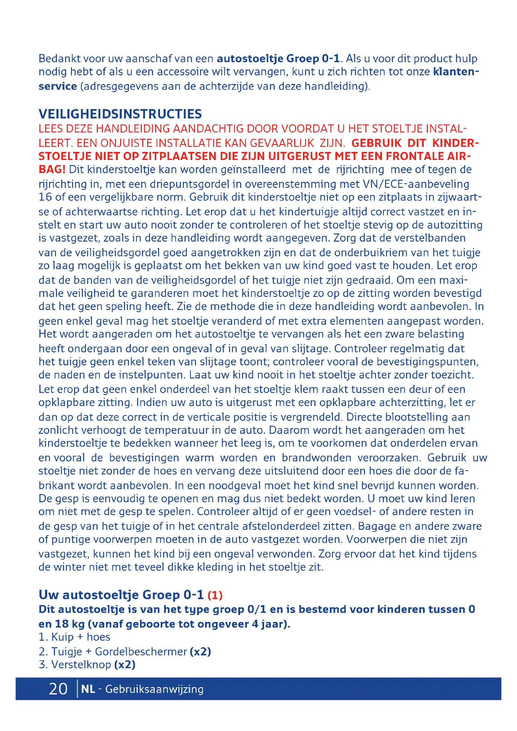 - Wenden Sie sich in Zweifelsfällen an den Hersteller des Rückhaltesystems oder an Ihren Händler.20 NL - Gebruiksaanwijzing Bedankt voor uw aanschaf van een autostoeltje Groep 0-1. Als u voor dit product hulp nodig hebt of als u een accessoire wilt vervangen, kunt u zich richten tot onze klanten- service (adresgegevens aan de achterzijde van deze handleiding). VEILIGHEIDSINSTRUCTIES LEES DEZE HANDLEIDING AANDACHTIG DOOR VOORDAT U HET STOELTJE INSTAL- LEERT. EEN ONJUISTE INSTALLATIE KAN GEVAARLIJK ZIJN. GEBRUIK DIT KINDER- STOELTJE NIET OP ZITPLAATSEN DIE ZIJN UITGERUST MET EEN FRONTALE AIR- BAG! Dit kinderstoeltje kan worden geïnstalleerd met de rijrichting mee of tegen de rijrichting in, met een driepuntsgordel in overeenstemming met VN/ECE-aanbeveling 16 of een vergelijkbare norm. Gebruik dit kinderstoeltje niet op een zitplaats in zijwaart- se of achterwaartse richting. Let erop dat u het kindertuigje altijd correct vastzet en in- stelt en start uw auto nooit zonder te controleren of het stoeltje stevig op de autozitting is vastgezet, zoals in deze handleiding wordt aangegeven. Zorg dat de verstelbanden van de veiligheidsgordel goed aangetrokken zijn en dat de onderbuikriem van het tuigje zo laag mogelijk is geplaatst om het bekken van uw kind goed vast te houden. Let erop dat de banden van de veiligheidsgordel of het tuigje niet zijn gedraaid. Om een maxi- male veiligheid te garanderen moet het kinderstoeltje zo op de zitting worden bevestigd dat het geen speling heeft. Zie de methode die in deze handleiding wordt aanbevolen. In geen enkel geval mag het stoeltje veranderd of met extra elementen aangepast worden. Het wordt aangeraden om het autostoeltje te vervangen als het een zware belasting heeft ondergaan door een ongeval of in geval van slijtage. Controleer regelmatig dat het tuigje geen enkel teken van slijtage toont; controleer vooral de bevestigingspunten, de naden en de instelpunten. Laat uw kind nooit in het stoeltje achter zonder toezicht. Let erop dat geen enkel onderdeel van het stoeltje klem raakt tussen een deur of een opklapbare zitting. Indien uw auto is uitgerust met een opklapbare achterzitting, let er dan op dat deze correct in de verticale positie is vergrendeld. Directe blootstelling aan zonlicht verhoogt de temperatuur in de auto. Daarom wordt het aangeraden om het kinderstoeltje te bedekken wanneer het leeg is, om te voorkomen dat onderdelen ervan en vooral de bevestigingen warm worden en brandwonden veroorzaken. Gebruik uw stoeltje niet zonder de hoes en vervang deze uitsluitend door een hoes die door de fa- brikant wordt aanbevolen. In een noodgeval moet het kind snel bevrijd kunnen worden. De gesp is eenvoudig te openen en mag dus niet bedekt worden. U moet uw kind leren om niet met de gesp te spelen. Controleer altijd of er geen voedsel- of andere resten in de gesp van het tuigje of in het centrale afstelonderdeel zitten. Bagage en andere zware of puntige voorwerpen moeten in de auto vastgezet worden. Voorwerpen die niet zijn vastgezet, kunnen het kind bij een ongeval verwonden. Zorg ervoor dat het kind tijdens de winter niet met teveel dikke kleding in het stoeltje zit. Uw autostoeltje Groep 0-1 (1) Dit autostoeltje is van het type groep 0/1 en is bestemd voor kinderen tussen 0 en 18 kg (vanaf geboorte tot ongeveer 4 jaar).