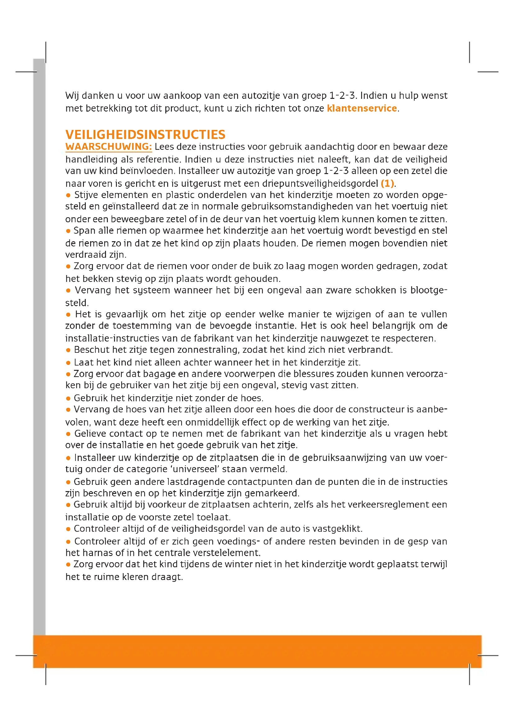 Gebruiksaanwijzing - NL Wij danken u voor uw aankoop van een autozitje van groep 1-2-3. Indien u hulp wenst met betrekking tot dit product, kunt u zich richten tot onze klantenservice. VEILIGHEIDSINSTRUCTIES WAARSCHUWING: Lees deze instructies voor gebruik aandachtig door en bewaar deze handleiding als referentie. Indien u deze instructies niet naleeft, kan dat de veiligheid van uw kind beïnvloeden. Installeer uw autozitje van groep 1-2-3 alleen op een zetel die naar voren is gericht en is uitgerust met een driepuntsveiligheidsgordel (1).