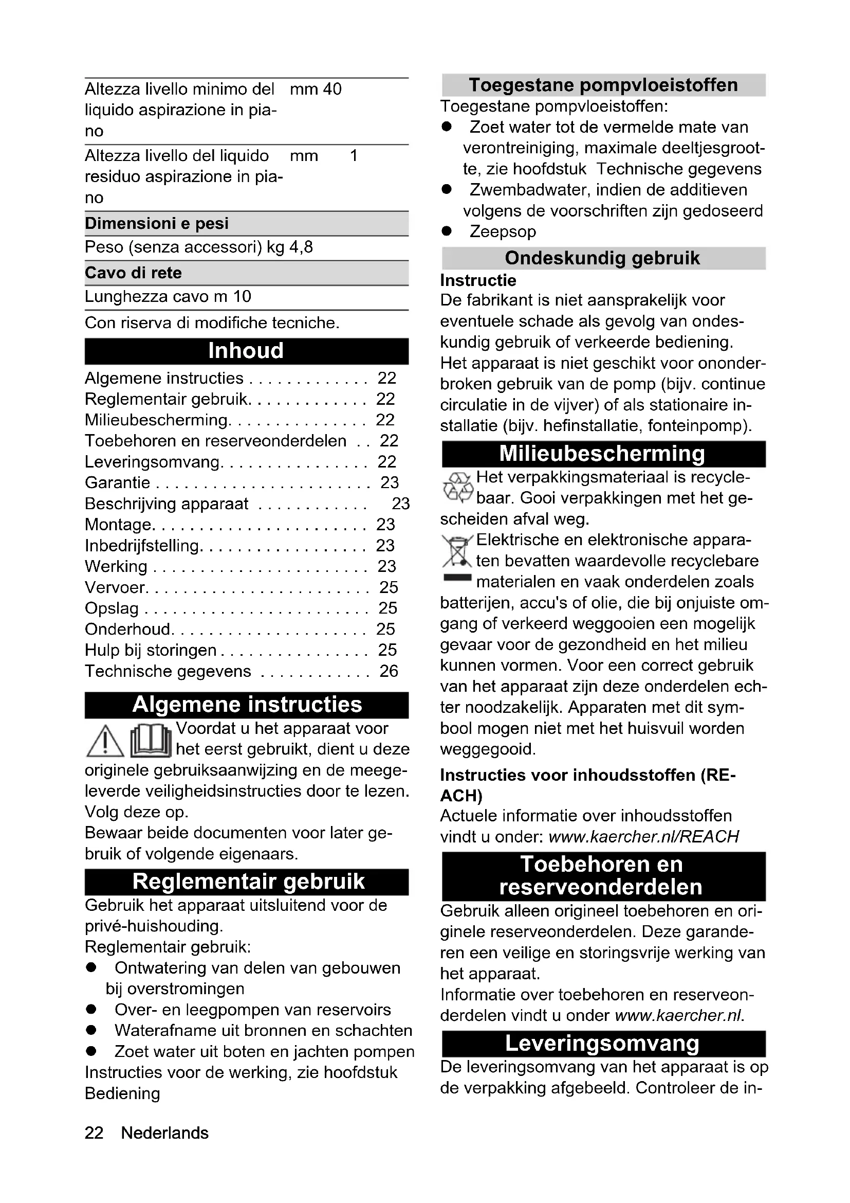 Altezza di disinserimento interruttore a galleggiante (dispositivo di blocco in posizione minima) mm 40-120 Funzionamento manuale Altezza livello minimo del liquido trasporto di sporci- zia e acque chiare mm 60 Altezza livello del liquido residuo trasporto di sporci- zia e acque chiare mm 2522 Nederlands Con riserva di modifiche tecniche. Inhoud Algemene instructies Voordat u het apparaat voor het eerst gebruikt, dient u deze originele gebruiksaanwijzing en de meege- leverde veiligheidsinstructies door te lezen. Volg deze op. Bewaar beide documenten voor later ge- bruik of volgende eigenaars. Reglementair gebruik Gebruik het apparaat uitsluitend voor de privé-huishouding. Reglementair gebruik: Ontwatering van delen van gebouwen bij overstromingen Over- en leegpompen van reservoirs Waterafname uit bronnen en schachten Zoet water uit boten en jachten pompen Instructies voor de werking, zie hoofdstuk Bediening Toegestane pompvloeistoffen Toegestane pompvloeistoffen: Zoet water tot de vermelde mate van verontreiniging, maximale deeltjesgroot- te, zie hoofdstuk Technische gegevens Zwembadwater, indien de additieven volgens de voorschriften zijn gedoseerd Zeepsop Ondeskundig gebruik Instructie De fabrikant is niet aansprakelijk voor eventuele schade als gevolg van ondes- kundig gebruik of verkeerde bediening. Het apparaat is niet geschikt voor ononder- broken gebruik van de pomp (bijv. continue circulatie in de vijver) of als stationaire in- stallatie (bijv. hefinstallatie, fonteinpomp). Milieubescherming Het verpakkingsmateriaal is recycle- baar. Gooi verpakkingen met het ge- scheiden afval weg. Elektrische en elektronische appara- ten bevatten waardevolle recyclebare materialen en vaak onderdelen zoals batterijen, accu's of olie, die bij onjuiste om- gang of verkeerd weggooien een mogelijk gevaar voor de gezondheid en het milieu kunnen vormen. Voor een correct gebruik van het apparaat zijn deze onderdelen ech- ter noodzakelijk. Apparaten met dit sym- bool mogen niet met het huisvuil worden weggegooid. Instructies voor inhoudsstoffen (RE- ACH) Actuele informatie over inhoudsstoffen vindt u onder: www.kaercher.nl/REACH Toebehoren en reserveonderdelen Gebruik alleen origineel toebehoren en ori- ginele reserveonderdelen. Deze garande- ren een veilige en storingsvrije werking van het apparaat. Informatie over toebehoren en reserveon- derdelen vindt u onder www.kaercher.nl. Leveringsomvang De leveringsomvang van het apparaat is op de verpakking afgebeeld. Controleer de in- Altezza livello minimo del liquido aspirazione in pia-