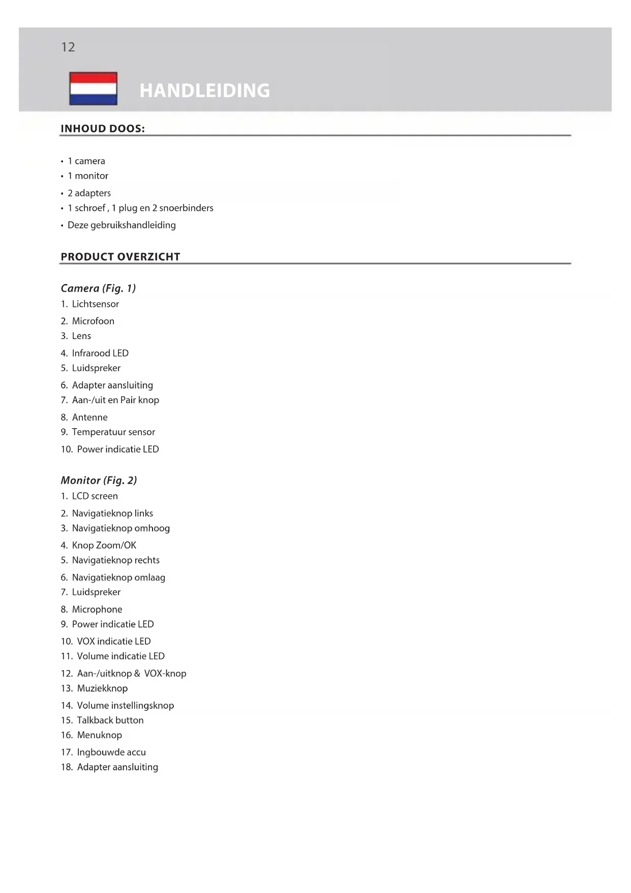 - Deze gebruikshandleiding PRODUCT OVERZICHT Camera (Fig. 1)