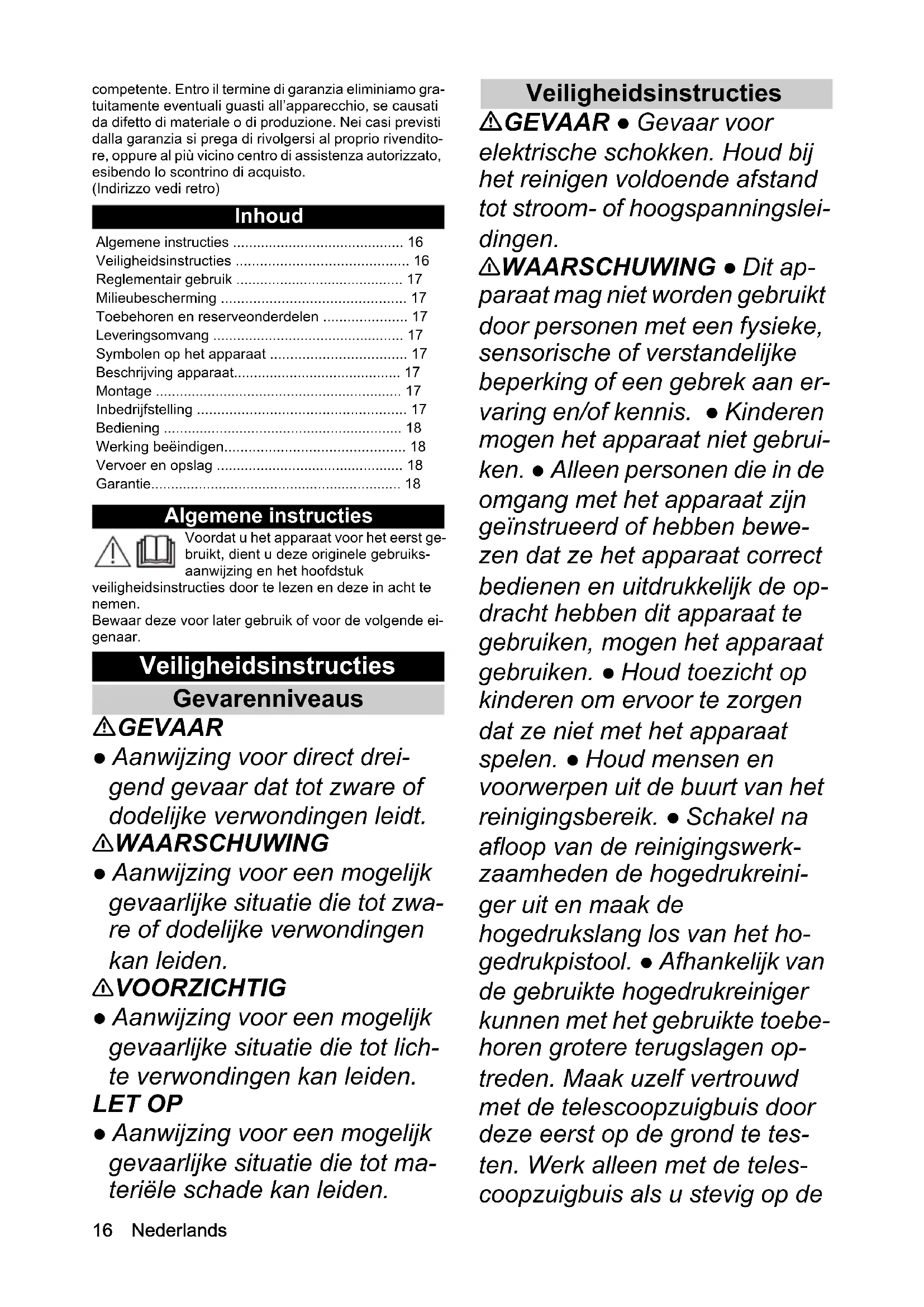 - Figura K a Premere e tenere premuta la leva di regolazione. b Reggendo il tubo telescopico inferiore, piegare il tubo telescopico superiore sul tubo telescopico inferiore. c Rilasciare la leva di regolazione. Garanzia Le condizioni di garanzia valgono nel rispettivo paese di pubblicazione da parte della nostra società di vendita16 Nederlands competente. Entro il termine di garanzia eliminiamo gra- tuitamente eventuali guasti all’apparecchio, se causati da difetto di materiale o di produzione. Nei casi previsti dalla garanzia si prega di rivolgersi al proprio rivendito- re, oppure al più vicino centro di assistenza autorizzato, esibendo lo scontrino di acquisto. (Indirizzo vedi retro) Inhoud Algemene instructies Voordat u het apparaat voor het eerst ge- bruikt, dient u deze originele gebruiks- aanwijzing en het hoofdstuk veiligheidsinstructies door te lezen en deze in acht te nemen. Bewaar deze voor later gebruik of voor de volgende ei- genaar. Veiligheidsinstructies Gevarenniveaus GEVAAR ● Aanwijzing voor direct drei- gend gevaar dat tot zware of dodelijke verwondingen leidt. 몇 WAARSCHUWING ● Aanwijzing voor een mogelijk gevaarlijke situatie die tot zwa- re of dodelijke verwondingen kan leiden. 몇 VOORZICHTIG ● Aanwijzing voor een mogelijk gevaarlijke situatie die tot lich- te verwondingen kan leiden. LET OP ● Aanwijzing voor een mogelijk gevaarlijke situatie die tot ma- teriële schade kan leiden. Veiligheidsinstructies GEVAAR ● Gevaar voor elektrische schokken. Houd bij het reinigen voldoende afstand tot stroom- of hoogspanningslei- dingen. 몇 WAARSCHUWING ● Dit ap- paraat mag niet worden gebruikt door personen met een fysieke, sensorische of verstandelijke beperking of een gebrek aan er- varing en/of kennis. ● Kinderen mogen het apparaat niet gebrui- ken. ● Alleen personen die in de omgang met het apparaat zijn geïnstrueerd of hebben bewe- zen dat ze het apparaat correct bedienen en uitdrukkelijk de op- dracht hebben dit apparaat te gebruiken, mogen het apparaat gebruiken. ● Houd toezicht op kinderen om ervoor te zorgen dat ze niet met het apparaat spelen. ● Houd mensen en voorwerpen uit de buurt van het reinigingsbereik. ● Schakel na afloop van de reinigingswerk- zaamheden de hogedrukreini- ger uit en maak de hogedrukslang los van het ho- gedrukpistool. ● Afhankelijk van de gebruikte hogedrukreiniger kunnen met het gebruikte toebe- horen grotere terugslagen op- treden. Maak uzelf vertrouwd met de telescoopzuigbuis door deze eerst op de grond te tes- ten. Werk alleen met de teles- coopzuigbuis als u stevig op de Algemene instructies p. 16