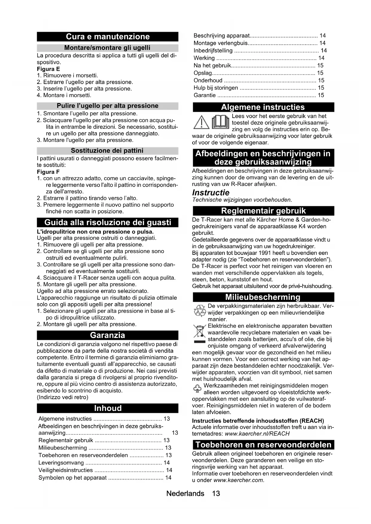 - Garanzia Le condizioni di garanzia valgono nel rispettivo paese di pubblicazione da parte della nostra società di vendita competente. Entro il termine di garanzia eliminiamo gra- tuitamente eventuali guasti all’apparecchio, se causati da difetto di materiale o di produzione. Nei casi previsti dalla garanzia si prega di rivolgersi al proprio rivendito- re, oppure al più vicino centro di assistenza autorizzato, esibendo lo scontrino di acquisto. (Indirizzo vedi retro) Inhoud Algemene instructies Lees voor het eerste gebruik van het toestel deze originele gebruiksaanwij- zing en volg de instructies erin op. Be- waar de originele gebruiksaanwijzing voor later gebruik of voor de volgende eigenaar. Afbeeldingen en beschrijvingen in deze gebruiksaanwijzing Afbeeldingen en beschrijvingen in deze gebruiksaanwij- zing kunnen door de omvang van de levering en de uit- rusting van uw R-Racer afwijken. Instructie Technische wijzigingen voorbehouden. Reglementair gebruik De T-Racer kan met alle Kärcher Home & Garden-ho- gedrukreinigers vanaf de apparaatklasse K4 worden gebruikt. Gedetailleerde gegevens over de apparaatklasse vindt u in de gebruiksaanwijzing van uw hogedrukreiniger. Bij apparaten tot bouwjaar 1991 heeft u bovendien een adapter nodig (zie “Toebehoren en reserveonderdelen”). De T-Racer is perfect voor het reinigen van vloeren en wanden met verschillende oppervlakken als tegels, steen, beton, kunststof en hout. Gebruik het apparaat uitsluitend voor de privé-huishouding. Milieubescherming De verpakkingsmaterialen zijn herbruikbaar. Ver- wijder verpakkingen op een milieuvriendelijke manier. Elektrische en elektronische apparaten bevatten waardevolle recyclebare materialen en vaak be- standdelen zoals batterijen, accu's of olie, die bij onjuiste omgang of verkeerd afvalverwijdering een mogelijk gevaar voor de gezondheid en het milieu kunnen vormen. Voor een correct werking van het ap- paraat zijn deze bestanddelen echter noodzakelijk. Ver- wijder apparaten, voorzien van dit symbool, niet samen met huishoudelijk afval. Werkzaamheden met reinigingsmiddelen mogen alleen worden uitgevoerd op vloeistofdichte werk- oppervlakken met een aansluiting op de vuilwateraf- voer. Reinigingsmiddelen niet in wateren of de bodem laten afvloeien. Instructies betreffende inhoudsstoffen (REACH) Actuele informatie over inhoudsstoffen treft u aan via in- ternetadres: www.kaercher.nl/REACH Toebehoren en reserveonderdelen Gebruik alleen origineel toebehoren en originele reser- veonderdelen. Deze garanderen een veilige en sto- ringsvrije werking van het apparaat. Informatie over toebehoren en reserveonderdelen vindt u onder www.kaercher.com. Algemene instructies p. 13