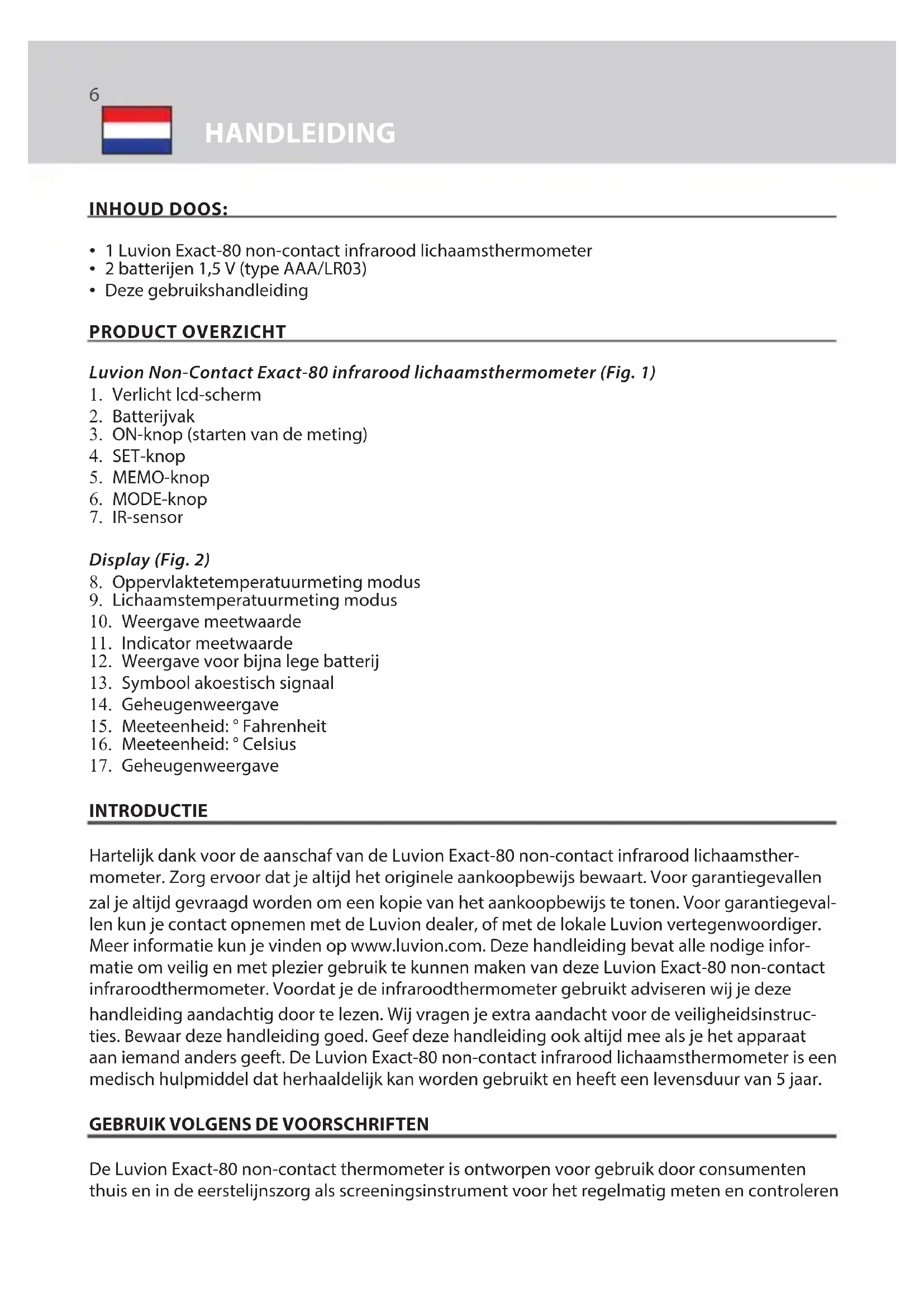 INTRODUCTIE Hartelijk dank voor de aanschaf van de Luvion Exact-80 non-contact infrarood lichaamsther- mometer. Zorg ervoor dat je altijd het originele aankoopbewijs bewaart. Voor garantiegevallen zal je altijd gevraagd worden om een kopie van het aankoopbewijs te tonen. Voor garantiegeval- len kun je contact opnemen met de Luvion dealer, of met de lokale Luvion vertegenwoordiger. Meer informatie kun je vinden op www.luvion.com. Deze handleiding bevat alle nodige infor- matie om veilig en met plezier gebruik te kunnen maken van deze Luvion Exact-80 non-contact infraroodthermometer. Voordat je de infraroodthermometer gebruikt adviseren wij je deze handleiding aandachtig door te lezen. Wij vragen je extra aandacht voor de veiligheidsinstruc- ties. Bewaar deze handleiding goed. Geef deze handleiding ook altijd mee als je het apparaat aan iemand anders geeft. De Luvion Exact-80 non-contact infrarood lichaamsthermometer is een medisch hulpmiddel dat herhaaldelijk kan worden gebruikt en heeft een levensduur van 5 jaar.