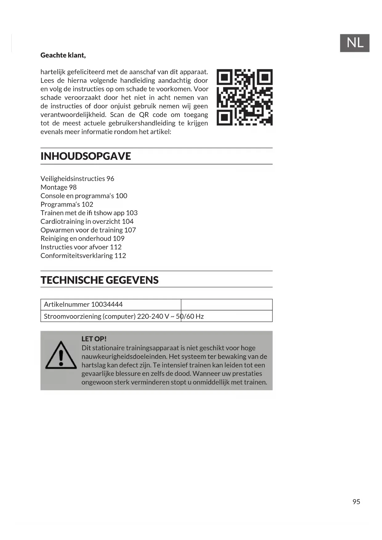 Geachte klant, hartelijk gefeliciteerd met de aanschaf van dit apparaat. Lees de hierna volgende handleiding aandachtig door en volg de instructies op om schade te voorkomen. Voor schade veroorzaakt door het niet in acht nemen van de instructies of door onjuist gebruik nemen wij geen verantwoordelijkheid. Scan de QR code om toegang tot de meest actuele gebruikershandleiding te krijgen evenals meer informatie rondom het artikel: INHOUDSOPGAVE Veiligheidsinstructies 96 Montage 98 Console en programma‘s 100 Programma‘s 102 Trainen met de i tshow app 103 Cardiotraining in overzicht 104 Opwarmen voor de training 107 Reiniging en onderhoud 109 Instructies voor afvoer 112 Conformiteitsverklaring 112 TECHNISCHE GEGEVENS Artikelnummer 10034444 Stroomvoorziening (computer) 220-240 V ~ 50/60 Hz LET OP! Dit stationaire trainingsapparaat is niet geschikt voor hoge nauwkeurigheidsdoeleinden. Het systeem ter bewaking van de hartslag kan defect zijn. Te intensief trainen kan leiden tot een gevaarlijke blessure en zelfs de dood. Wanneer uw prestaties ongewoon sterk verminderen stopt u onmiddellijk met trainen.96